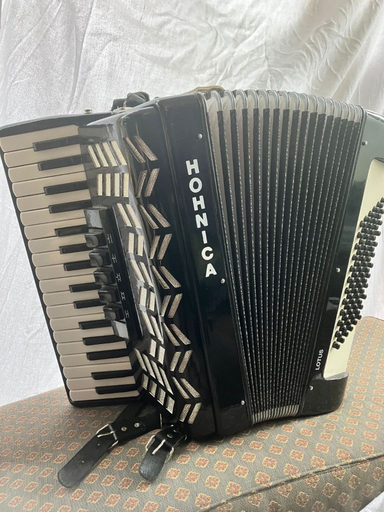 Lovely rocking chair with a wood frame and denim blue fabric cushions.