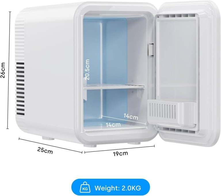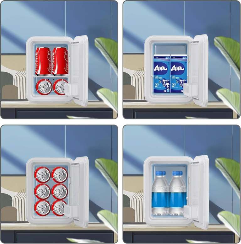 THIS MINI FRIDGE IS 4L CAPACITY, CAN HOLD UP TO 6 CANS, IT IS AC AND 12v POWER, PORTABLE COOLER AND WARMER, PORTABLE