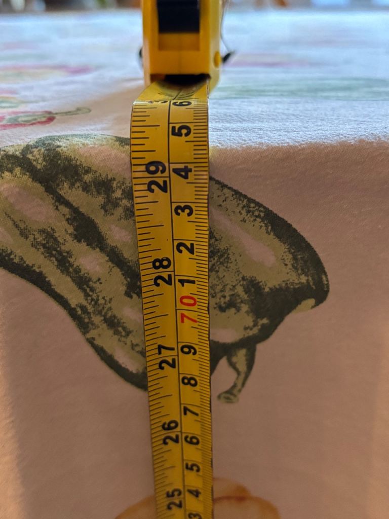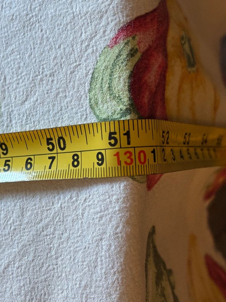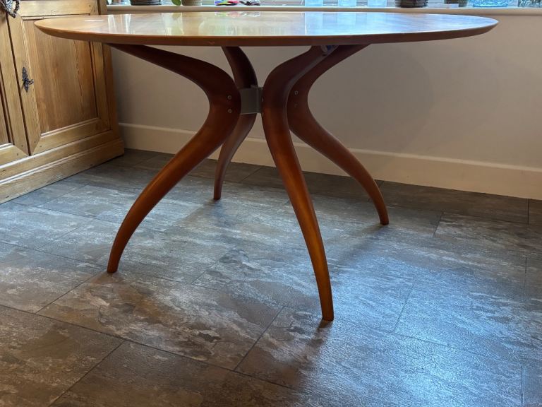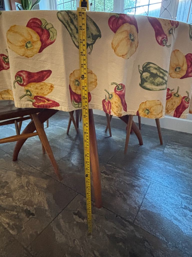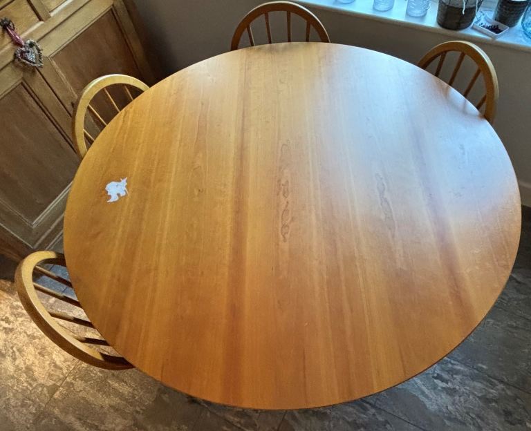 Round dining table, in my opinion will comfortably will seat 6, measurements approx diameter 130cm, approx height 75cm. Mark to top, please see photo but can be covered using tablecloth. Tablecloth and chairs in photos are NOT included. Please ask any questions, welcome to view