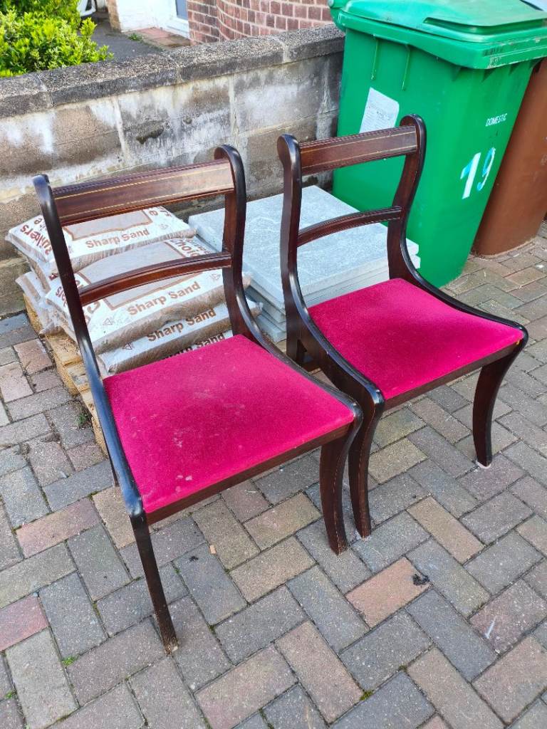 Two wooden dining chairs with red upholstered seats. Solid and sturdy but used, with some marks on the fabric (see photo). Could be cleaned or reupholstered. Free to collect. Collection NG8 3NY