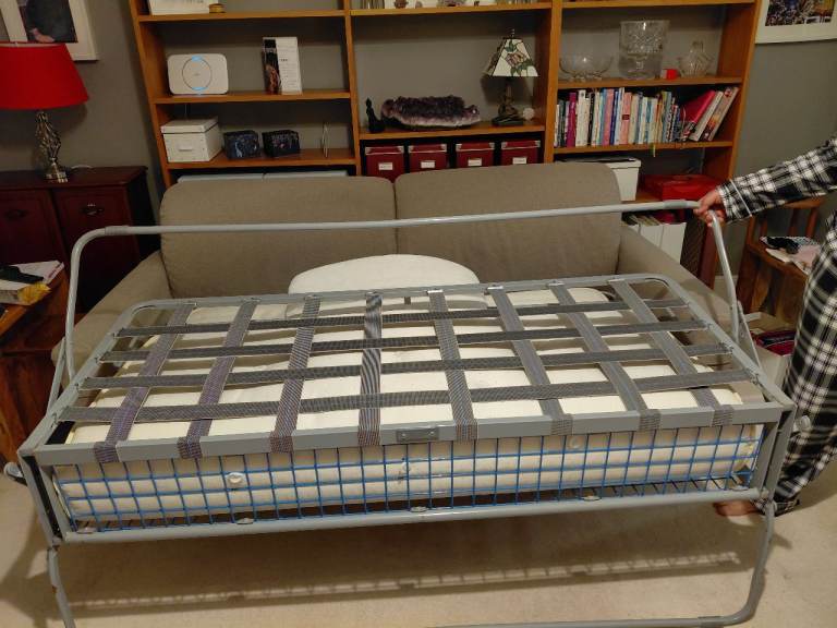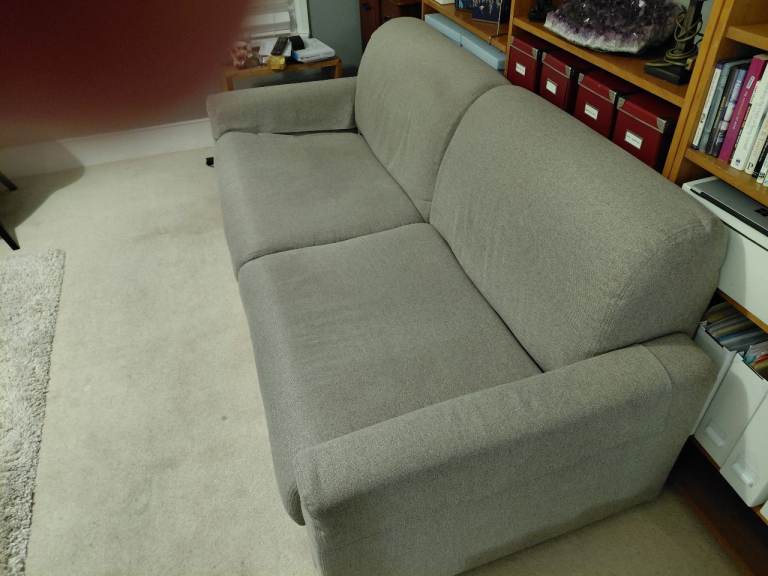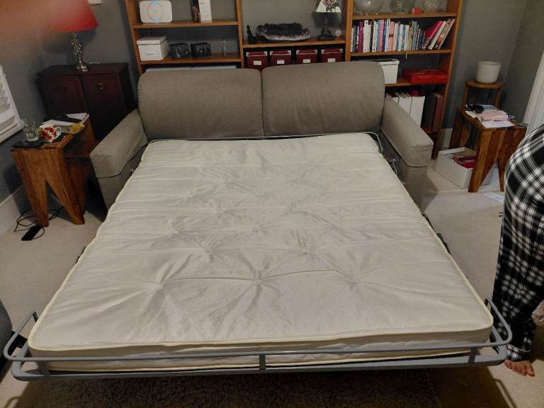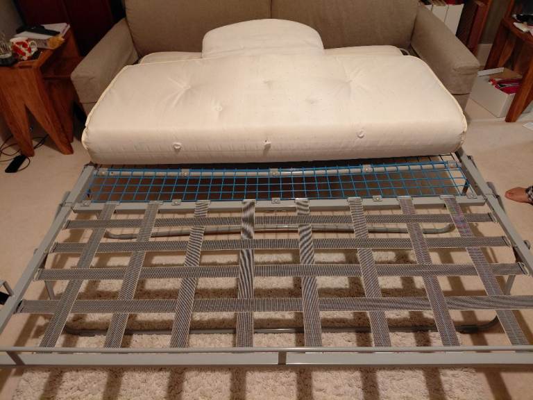 Italian mechanism. 2.10m wide by 95cm deep. Mattress very clean and like new (only slept on 5-6 times in 4 years). The back and arms can be unbolted for transport. Couple of soldered joints on the backrest have cracked with slight movement. Would be fine if placed against a wall. Collection ASAP. Please call or text me if interested and leave a message if i am unable to answer.