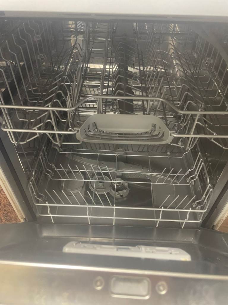 Used dishwasher. There is a humming sound coming from inside the machine when switched on, dont know what it is but the machine is working perfectly fine. No spoon rack. You will need to purchase a waste water hose that you will require you to open the machine in order to fit it., so if you dont known how to do this you need to arrange a fitter.