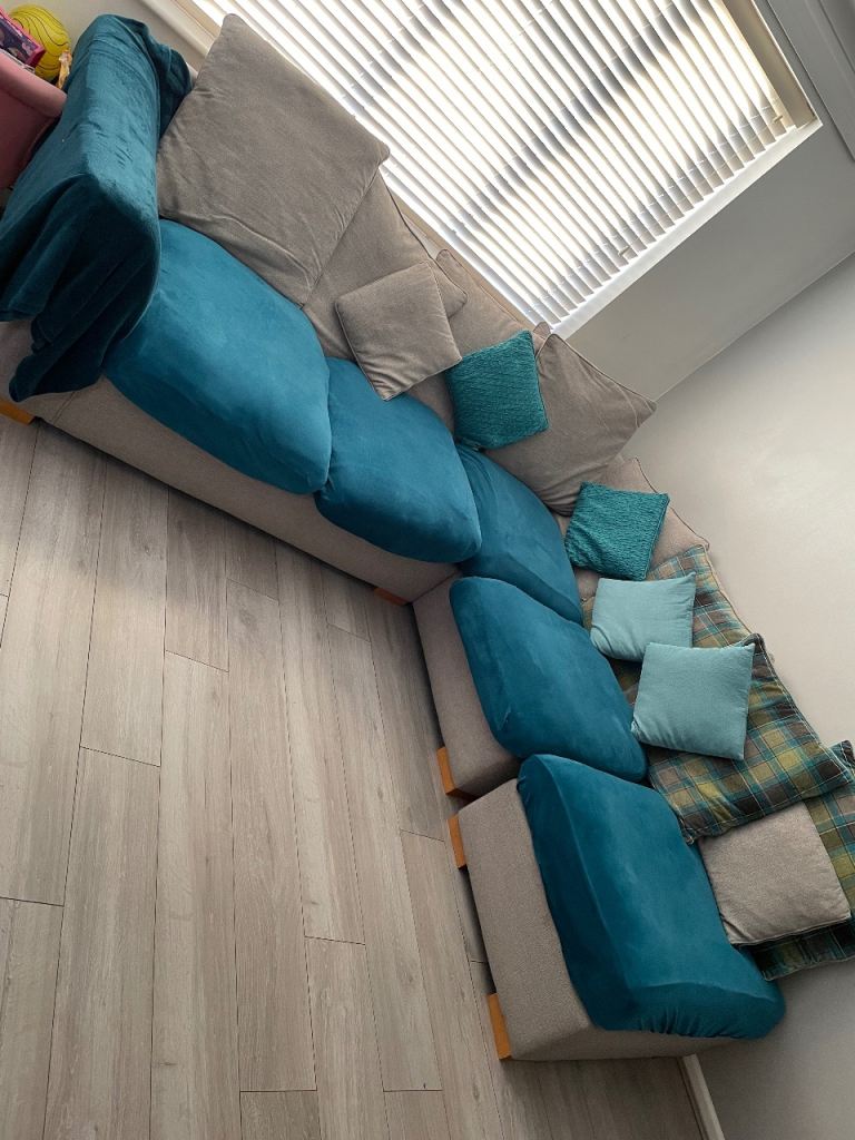 3 part corner sofa: x2 160x98x68cm and footstool. Grey. Has green cushion covers on. Need gone next weekend