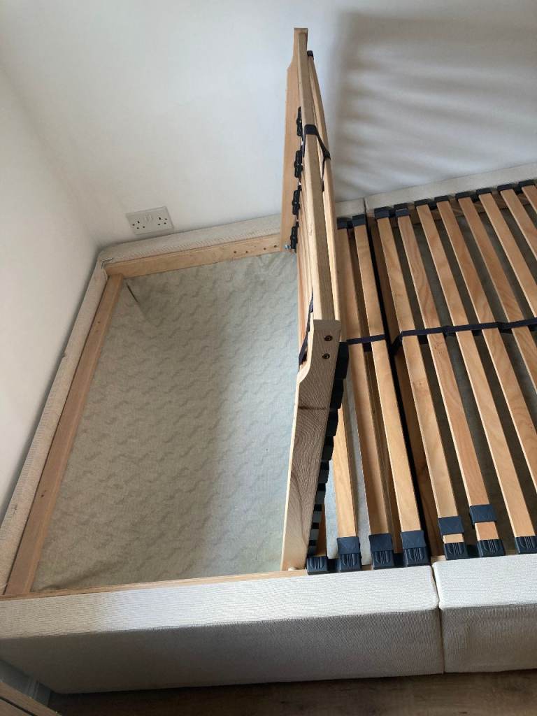 Bed frame is on wheels and moves easily. Wood slats are all intact and good condition and lift up for some storage which is useful for spare pillows or sheets.