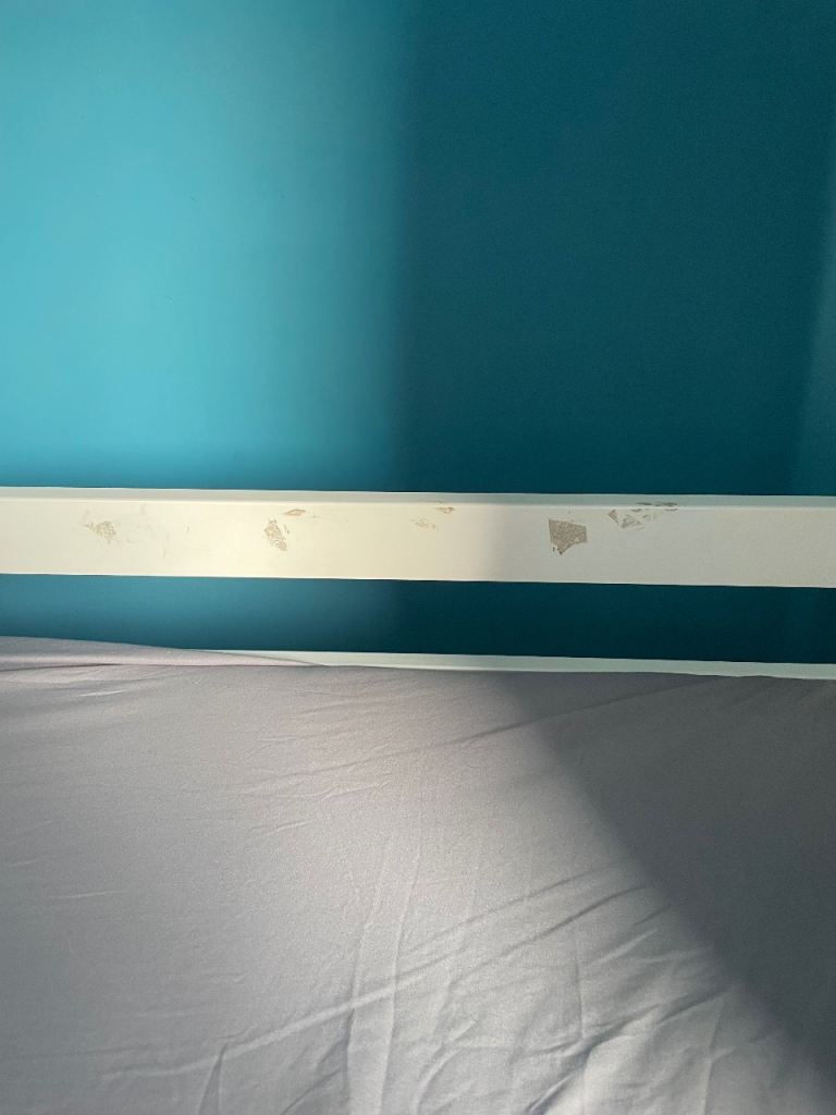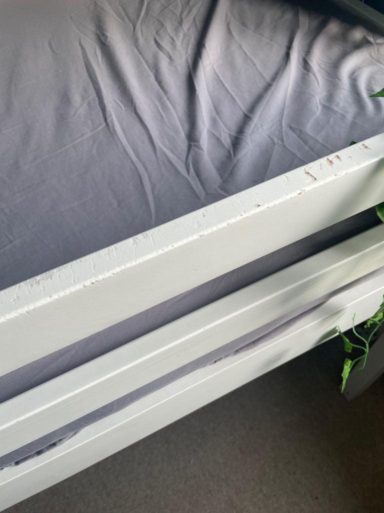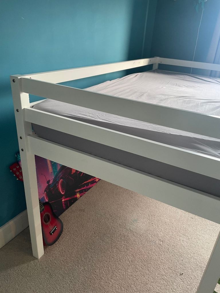 Free kids mid sleeper bed in white. Our son has now outgrown it but it still has plenty of life left in it. Few sticker marks and marks on it where it has been bashed with toys (can be seen in photographs). No time wasters please. Mattress not included.