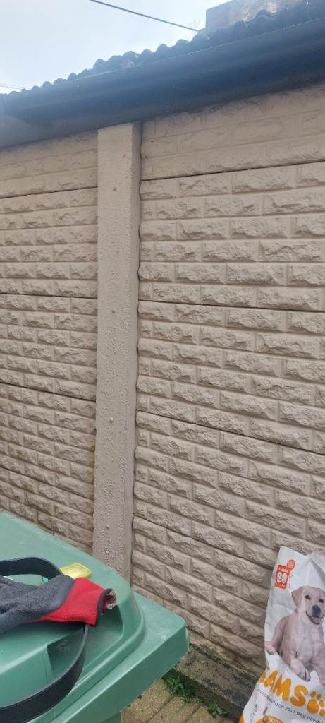 This is a self assembly style garage, comprising of concrete pre-cast panels and posts, (steel reinforced), a steel up and over traditional garage door, a steel hinged side personal door, cement based corrugated sheet panel roof supported on mild steel roof trusses.