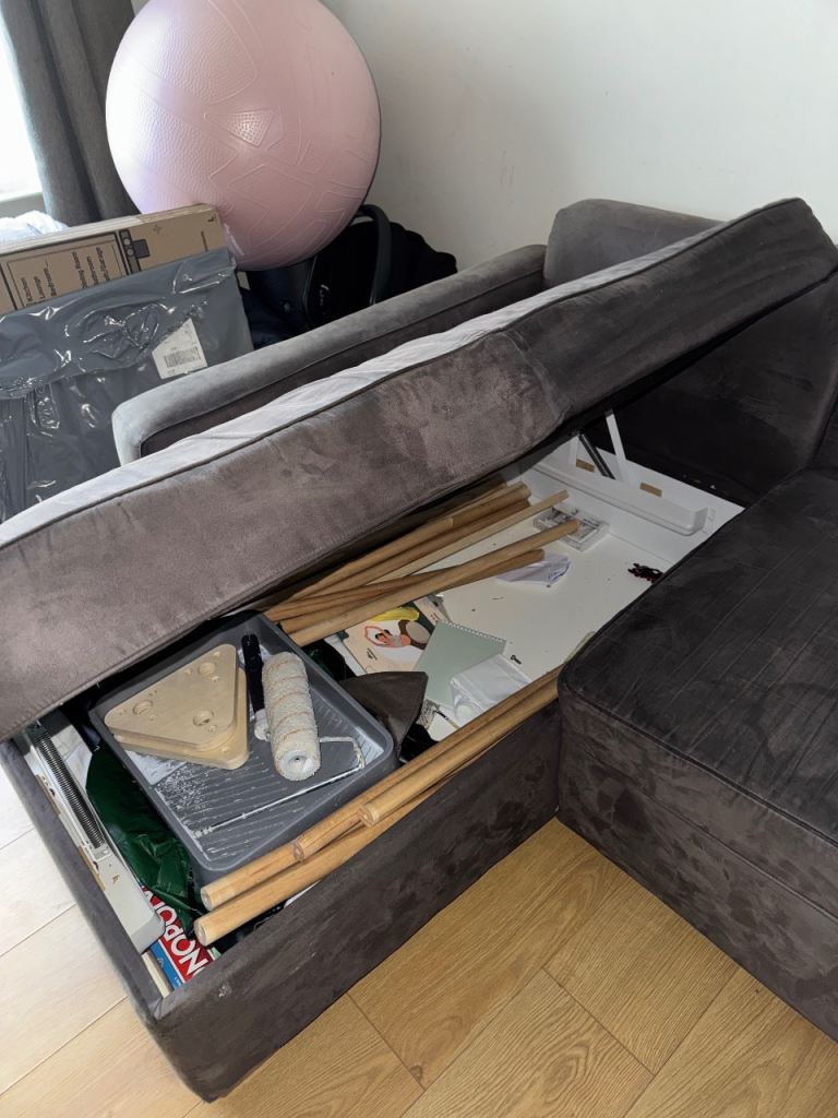 Sofa splits into 2 parts for easier transport. I can’t help with the removal so you need to book 2 people to take it out. It’s only 4 steps to take it outside my house.