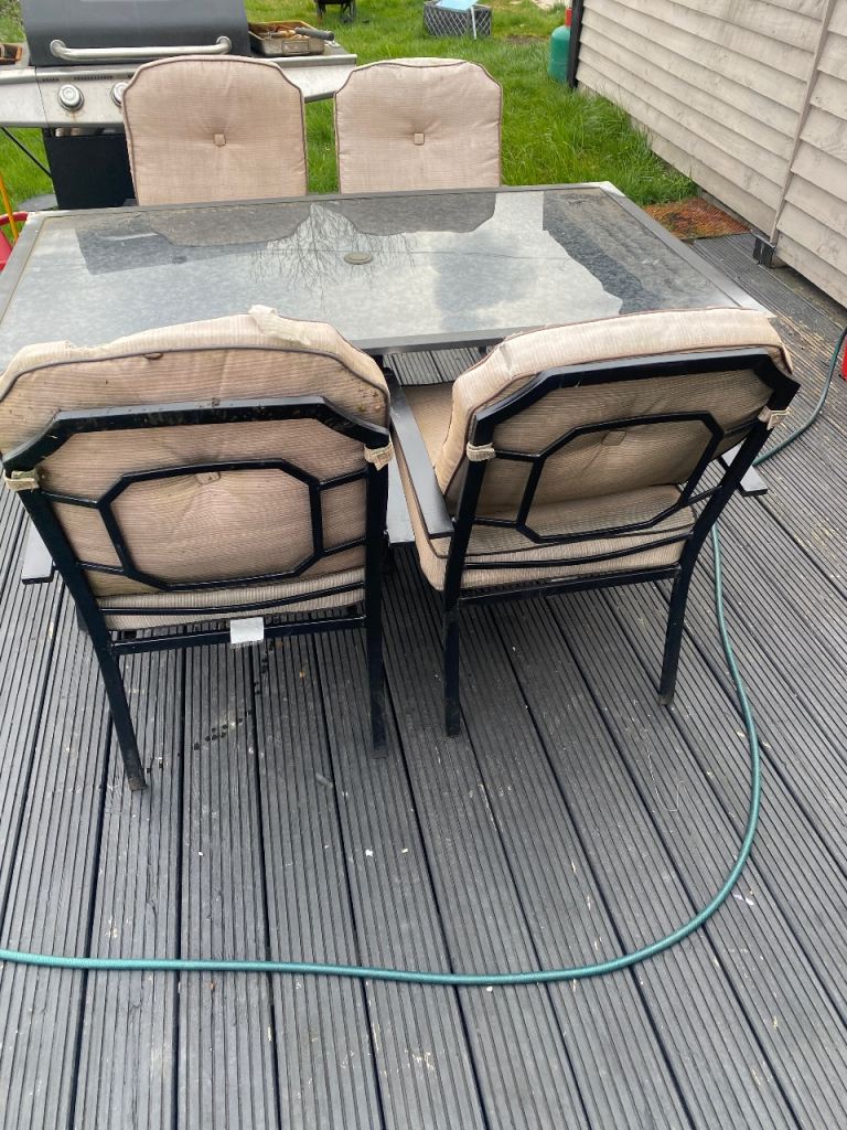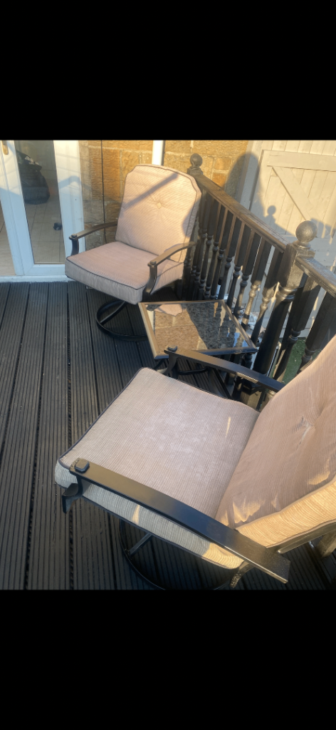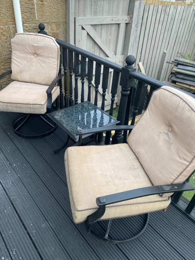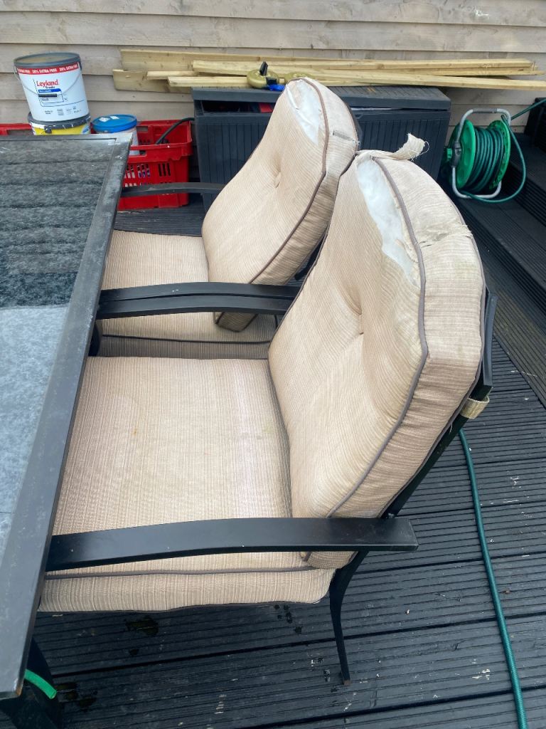 Garden furniture needs TLC the cushions are ripped and needs a good paint AS SOME RUST but was really comfortable and when painted and cushions sewn it will look good - cushions are waterproof but been sitting outside