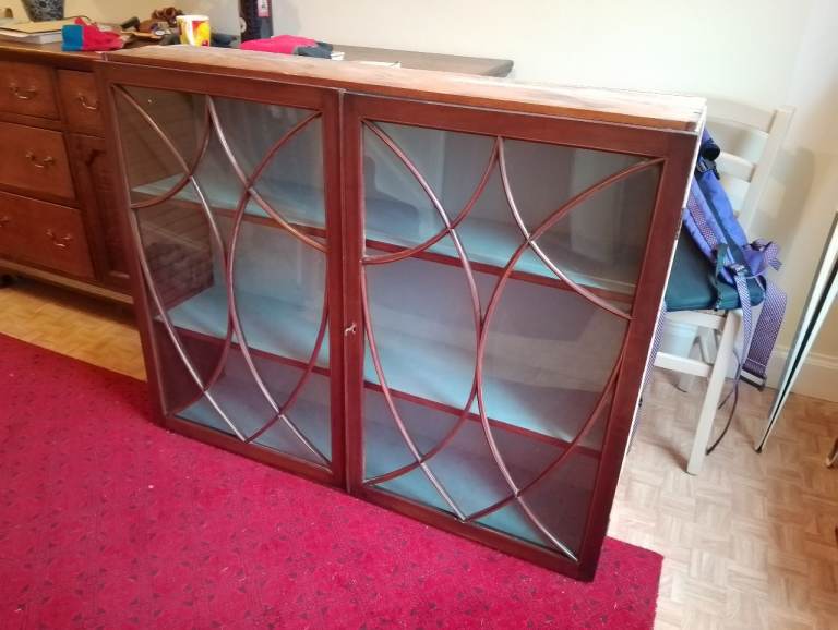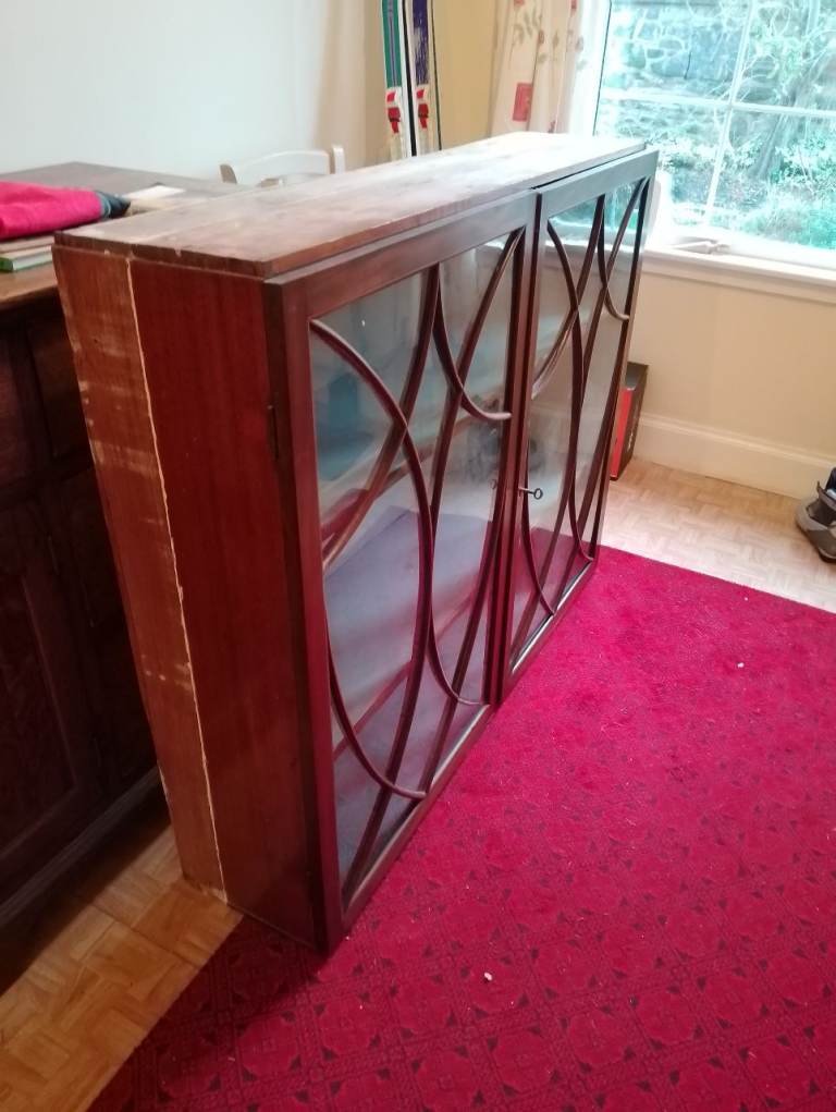 Georgian (?) display cabinet with original glass & astragals. Size 120cm x 96 x 29 deep. It's been "customised" by previous house owner by adding 10cm to make it deeper. Doors & sides thought to be mahogany. Two shelves but room for another if you wanted to add.