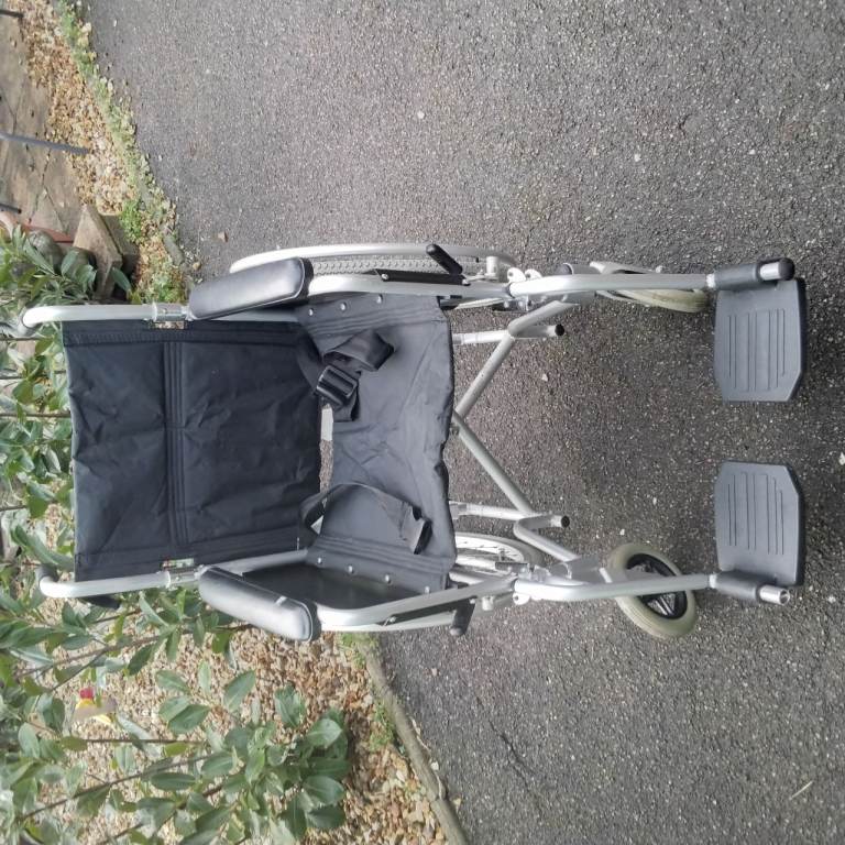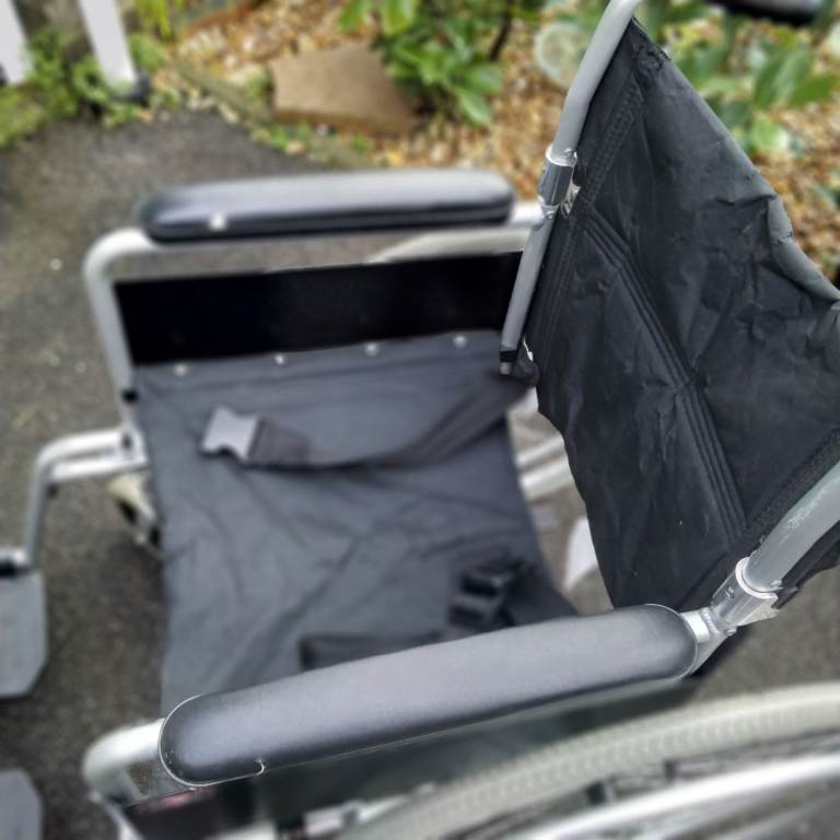 Preowned wheel chair used with slight damage to arm rests, wheels hold air in good working order.