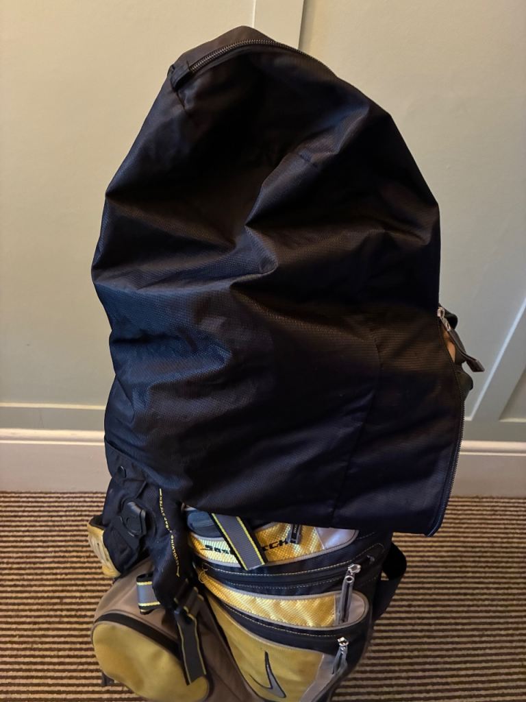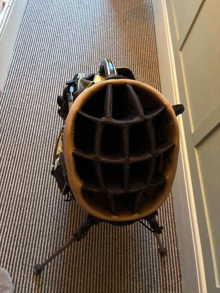 Used yellow Nike golf bag, 14 dividers, stand and straps to carry.