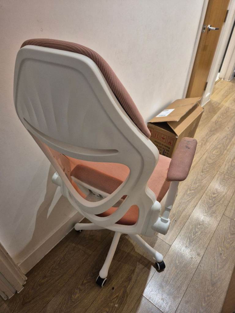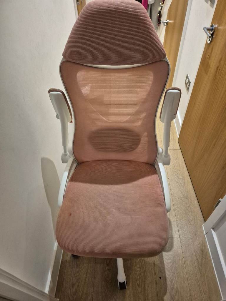 Used for a couple years. Some stains from arts and crafts that could come out if washed. Mechanically sound and quite comfortable. Has adjustable back support and arm rests go up and down.