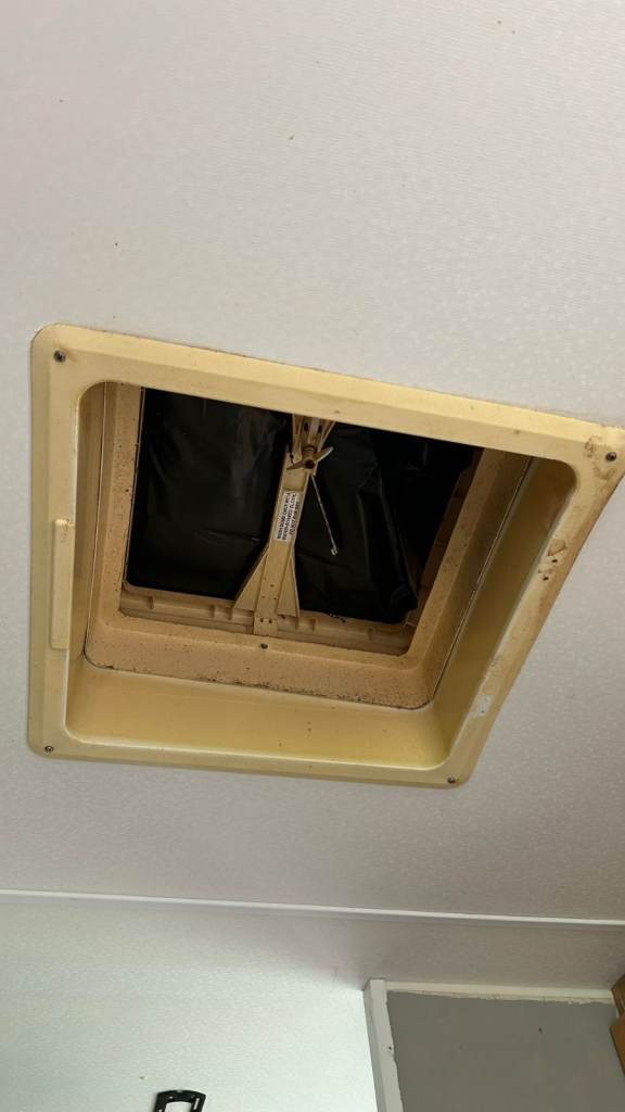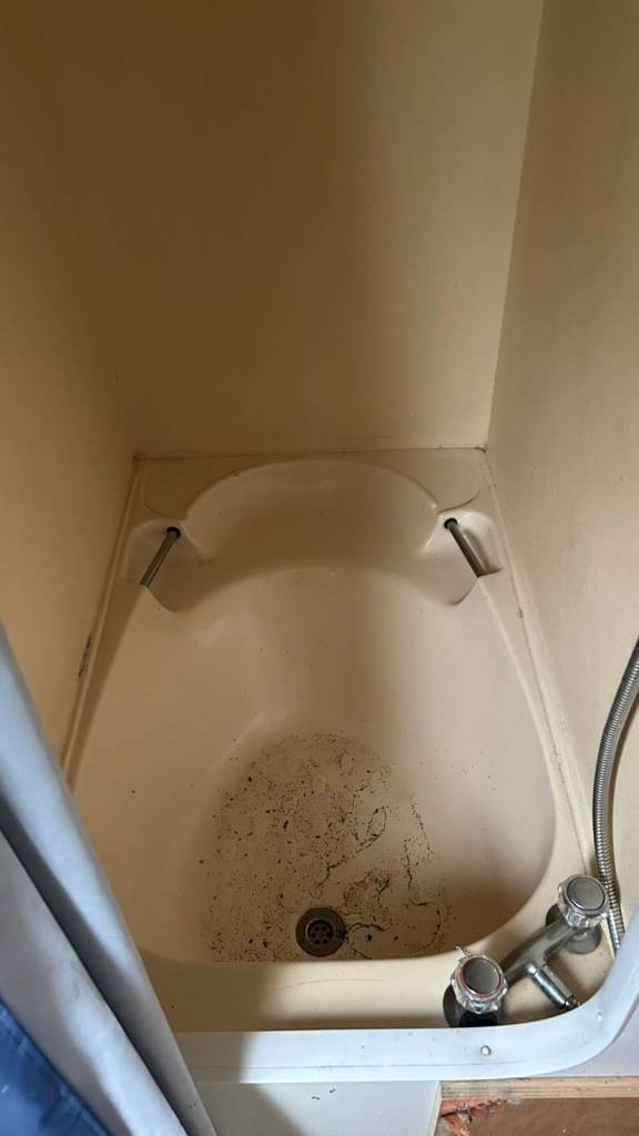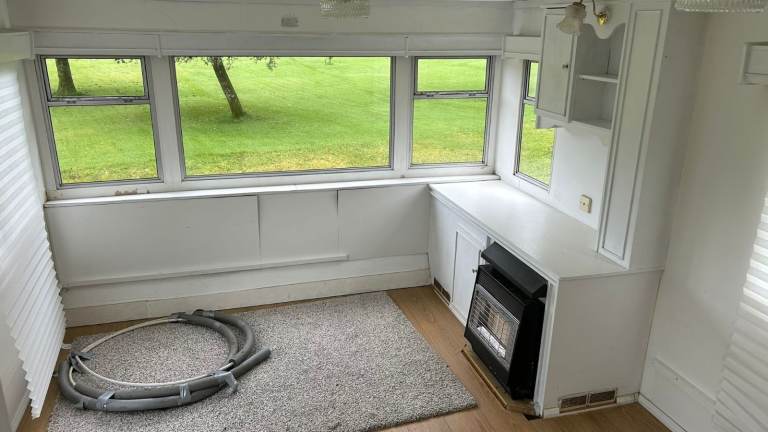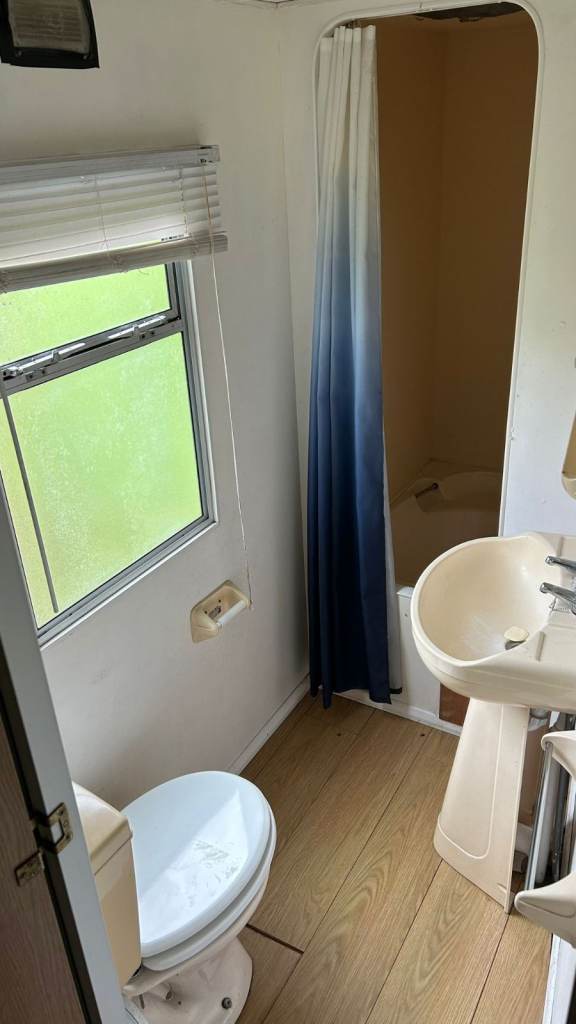 Kitchen ceiling vent and shower ceiling vent need replaced - both missing covers. Bathroom floor probably needs replacing. Unsure if water heater works. Single glazed windows. Only 1 of the 4 legs is in working condition so will need propped up elsewhere underneath. Some exterior cosmetic damage.