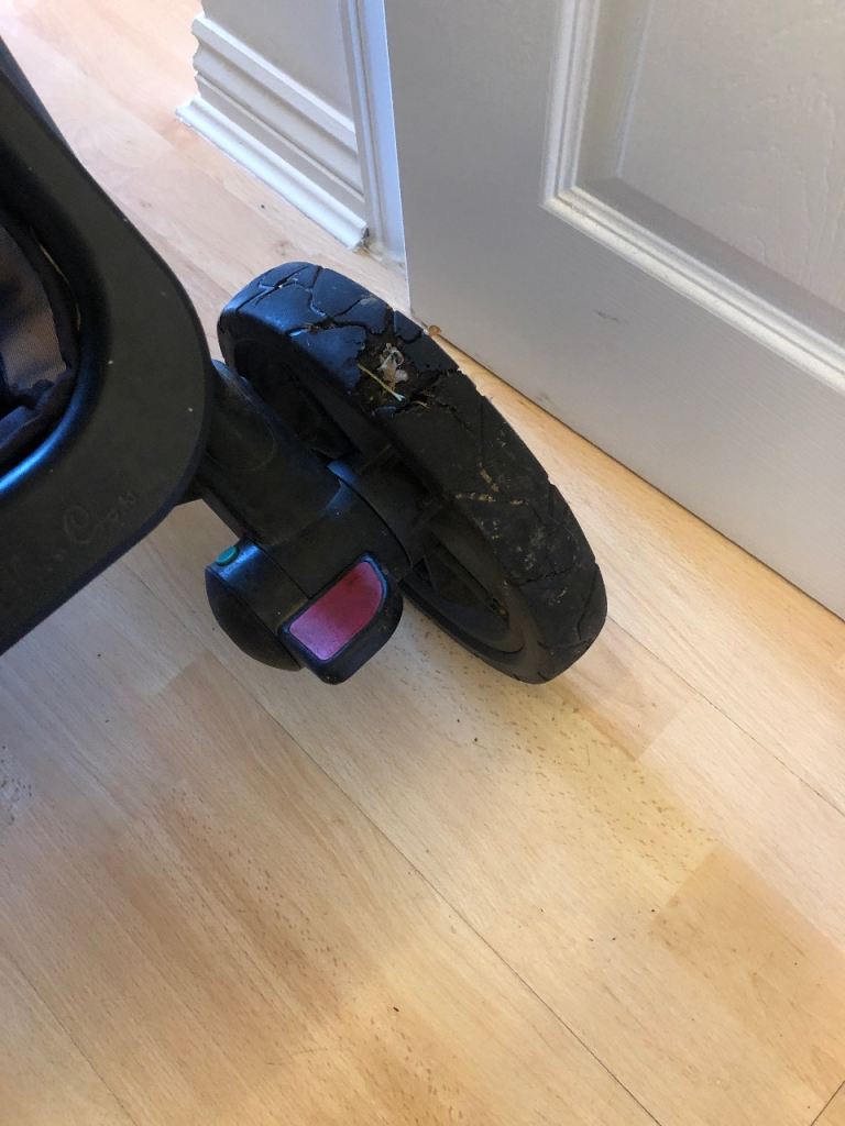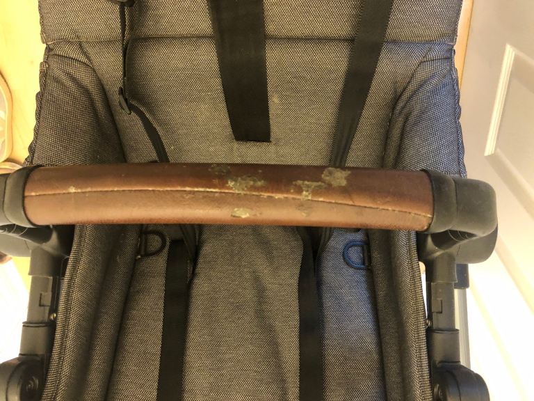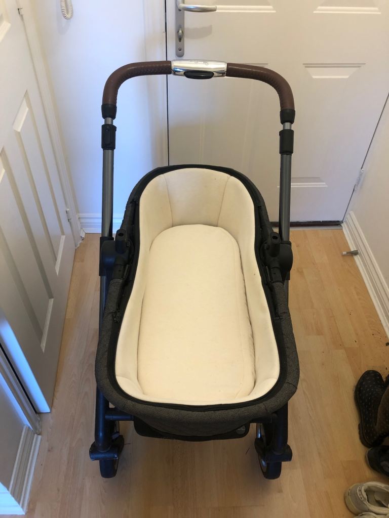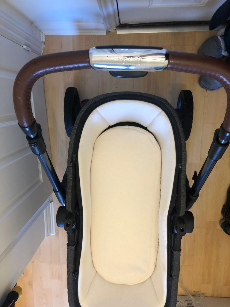 Well Loved Pram/Pushchair. Some wear and tear but still fully functional with lots of life left. There's a crack in the right rear wheel(Seems to be superficial and hasn't caused any issues) and some peeling on leather handle for carry cot. See pictures. Comes with rain cover, foot muff, lovely soft liner for pushchair, silver cross bag, and cup holder. From a smoke/pet free home.