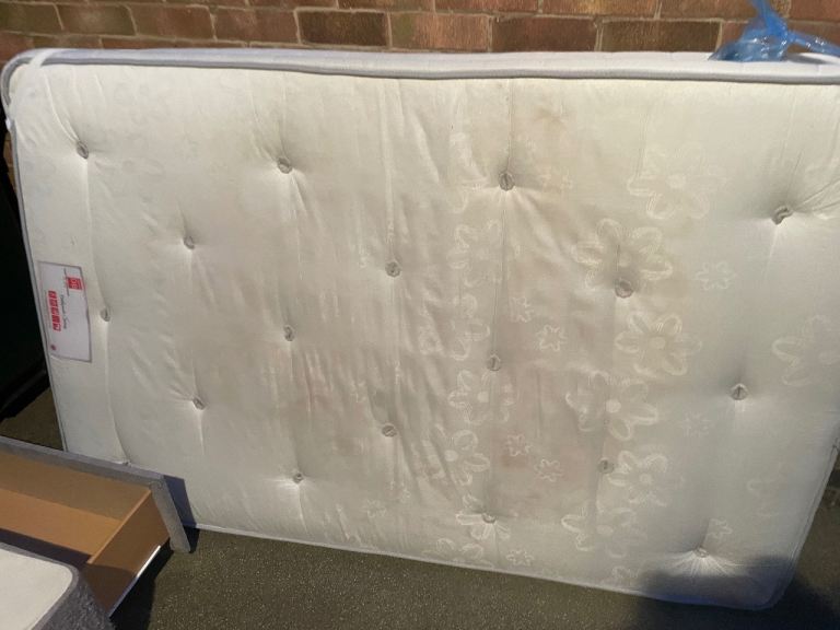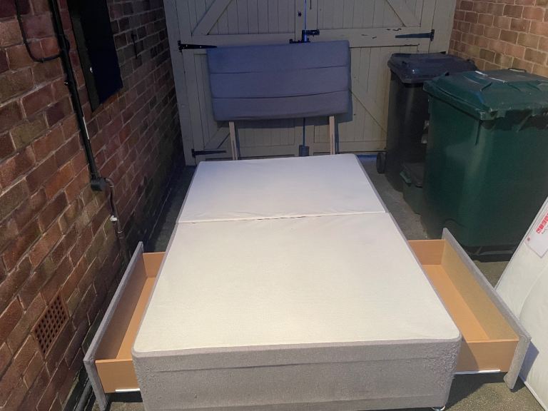Small double divan bed base with 2 draws and a matching headboard in grey fabric. In a good condition. Also have a mattress too which you are happy to take if you want it. Collection only. Carlton