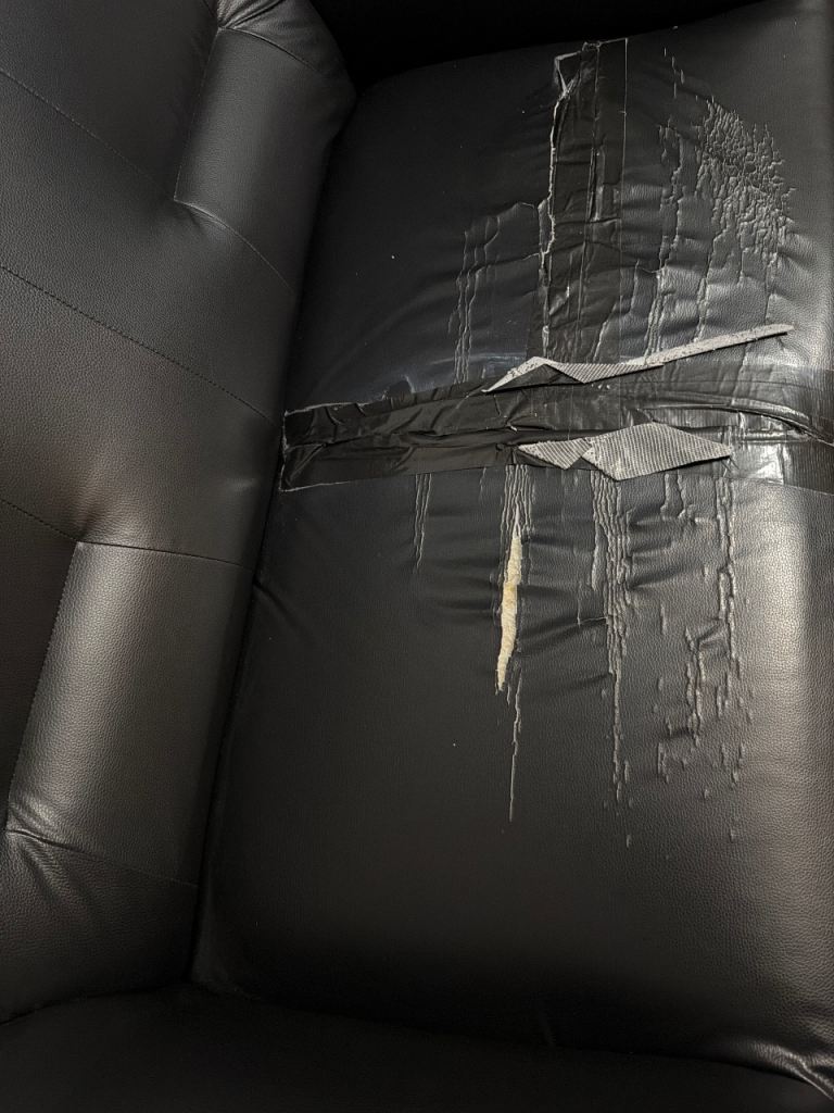 I’n good condition apart from sitting area as you can see in pic. Once a nice set of throw cover put over on you can’t feel rip tape or bumps or notice
