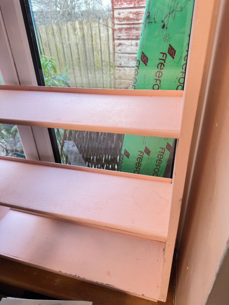 Solid wooden bookcase painted pink but could be repainted or stripped.