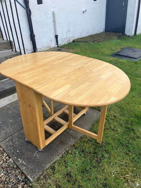 Wooden dining table and 4 wooden folding chairs that fit inside table when folded.