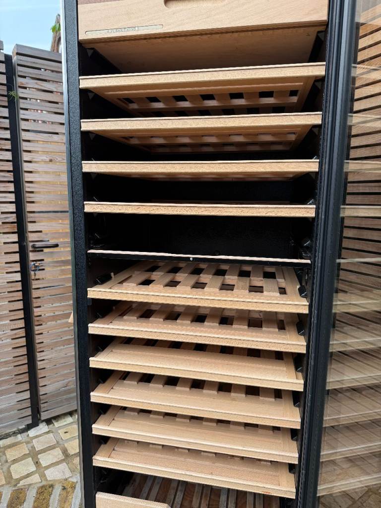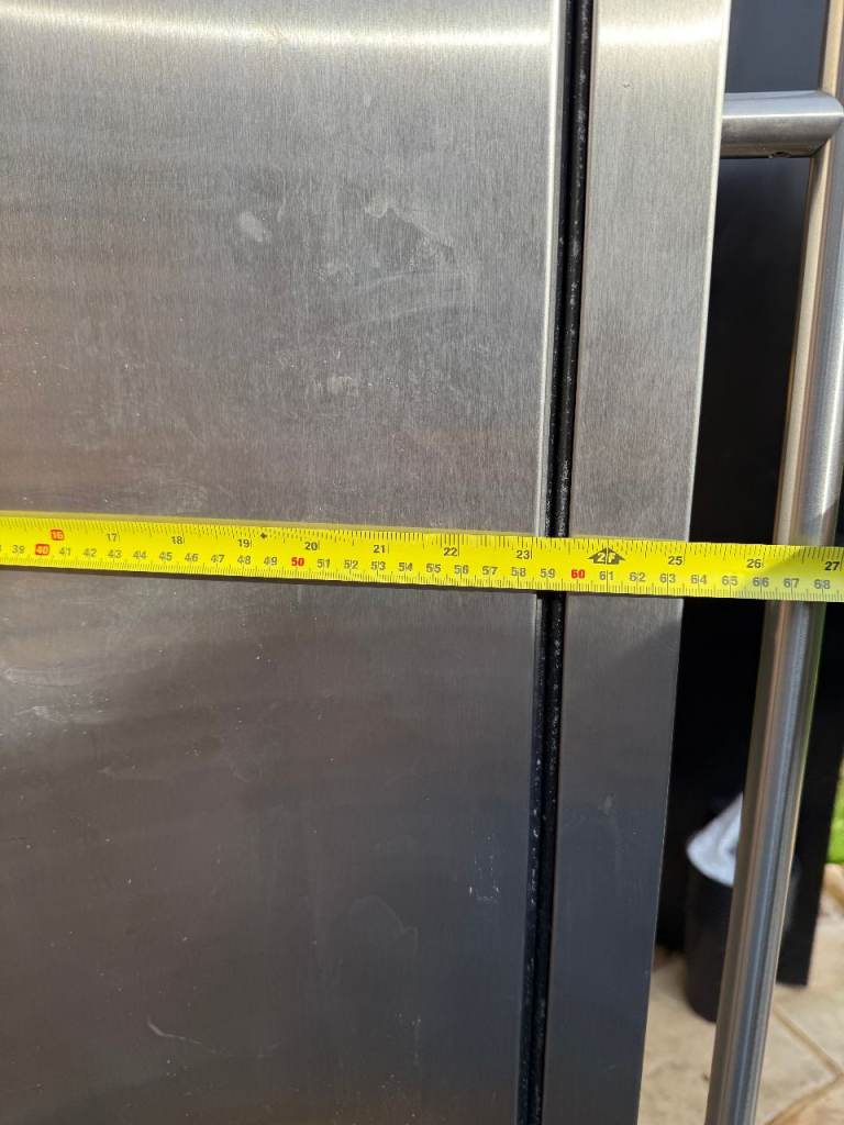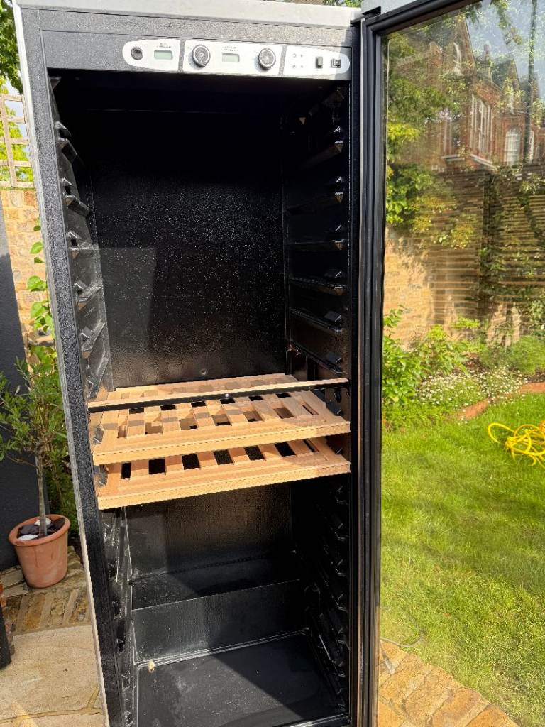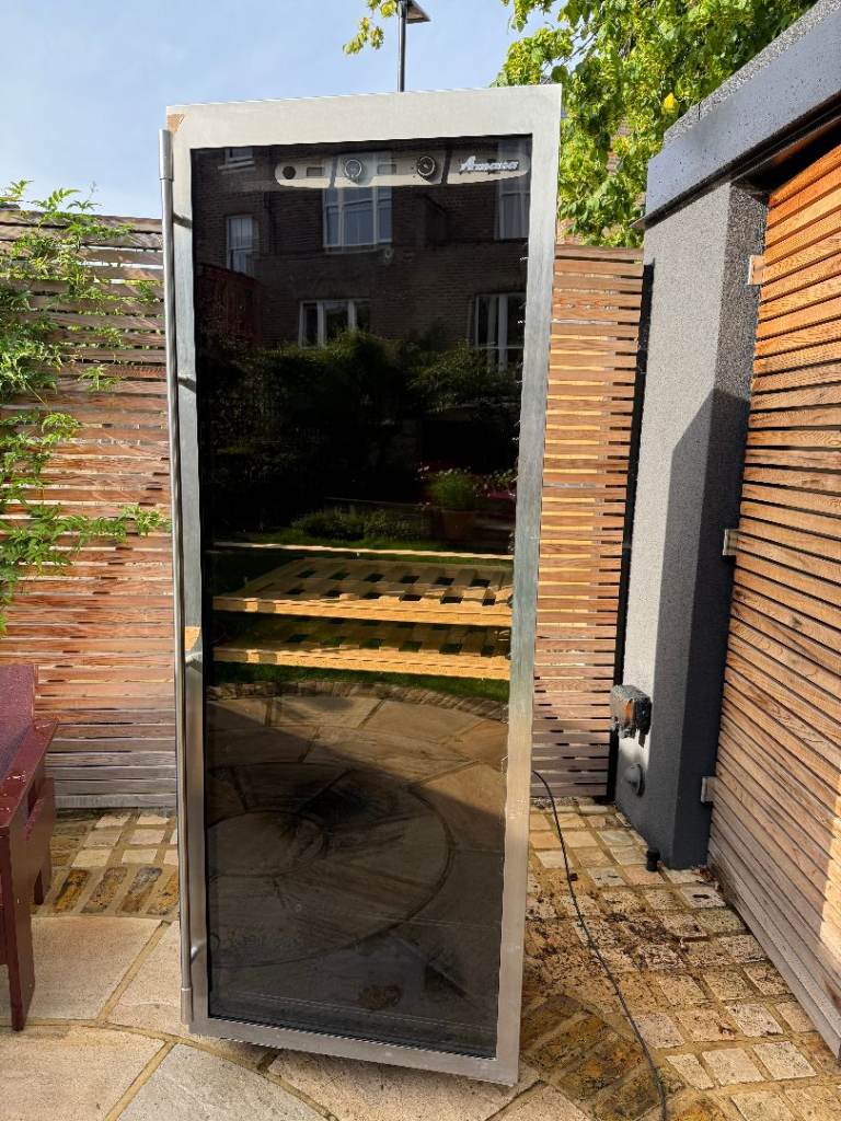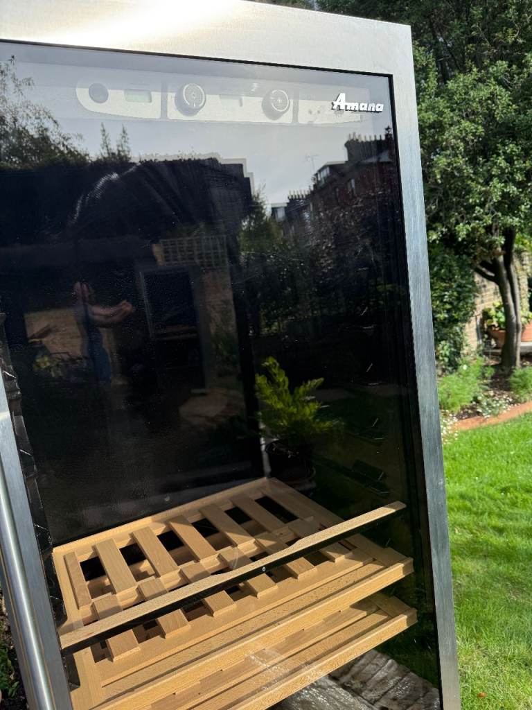 This premium freestanding glass door wine fridge has 3 separate chilling zones for different types of wine. It will hold about 90 bottles. 6ft tall, 27’ (68cm) wide, 25’ (63.5cm) deep. Good condition, although some of the wood in the lowest (chilled) drawer is a bit stained. The brand Amana is now Whirlpool. Comparable new domestic wine coolers of this type retail between £1500 and £4000.