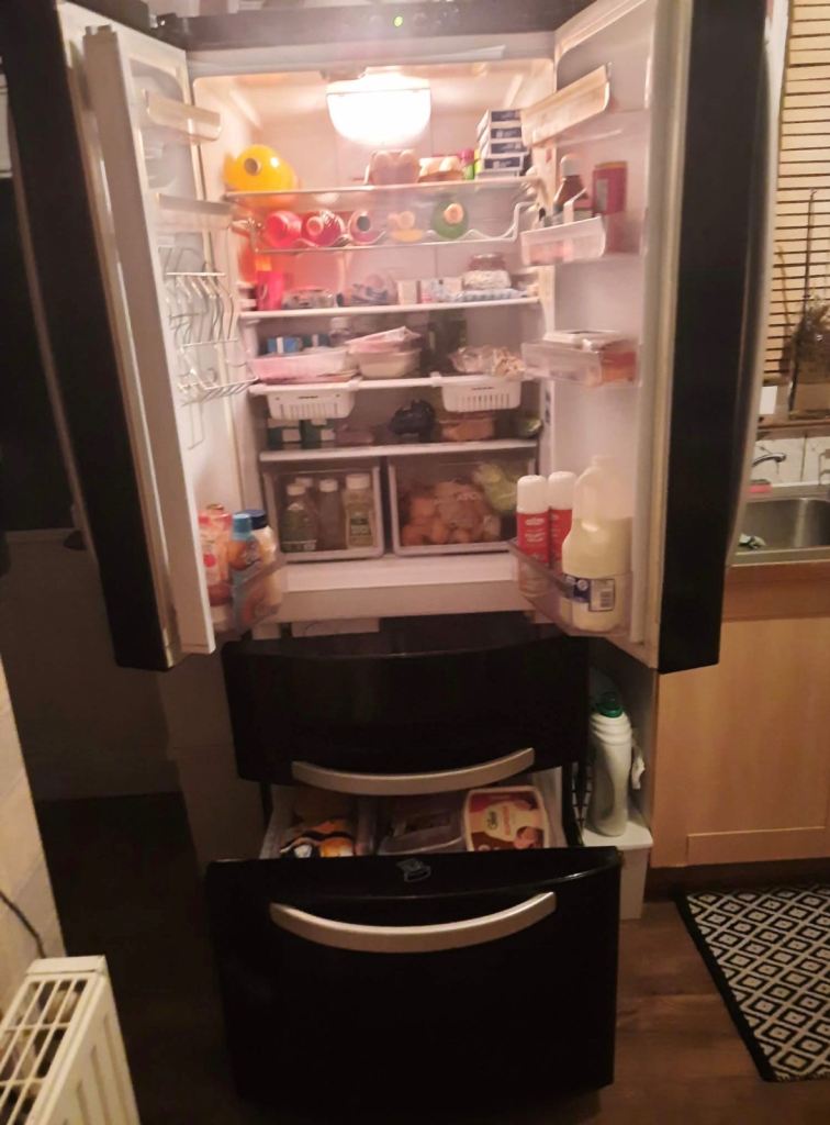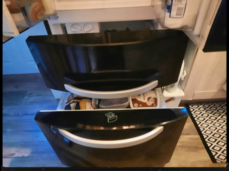 With double fridge doors on top half and freezer deep drawers on the bottom half of the fridge / freezer