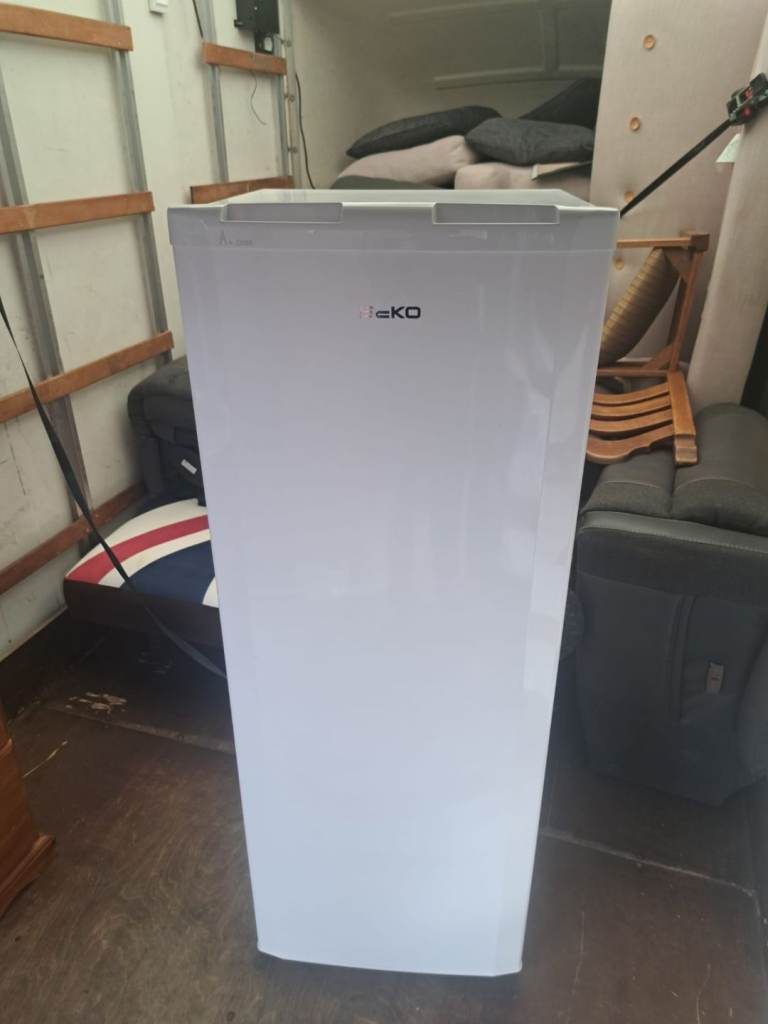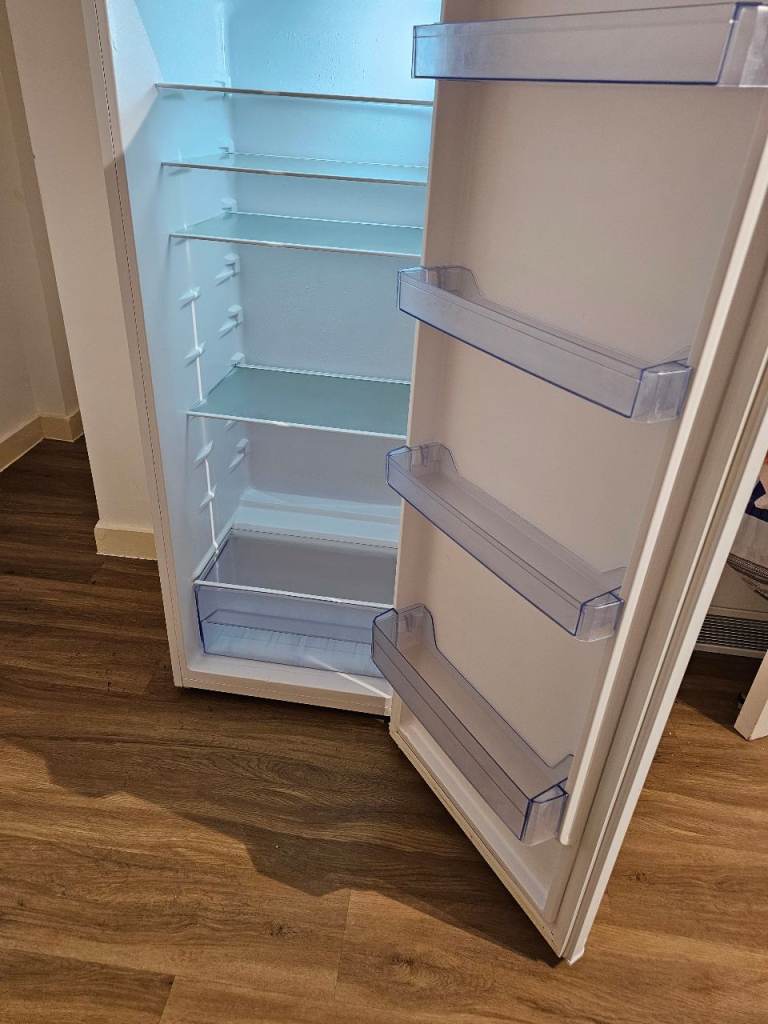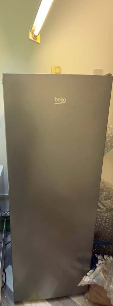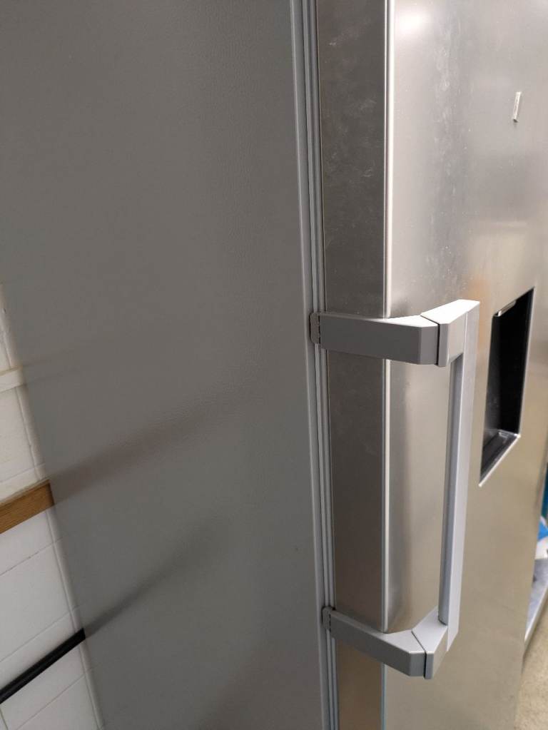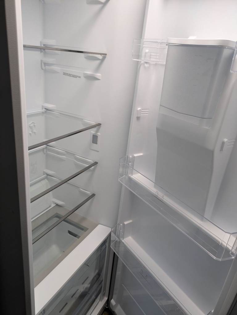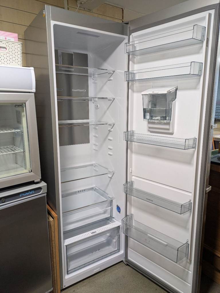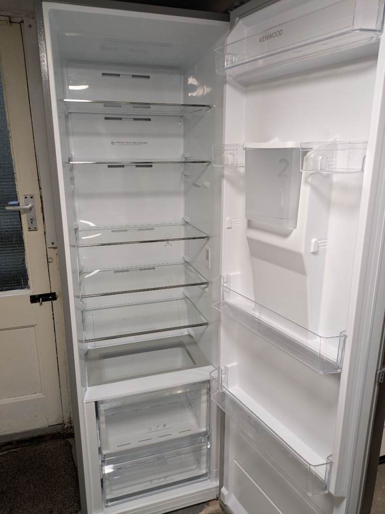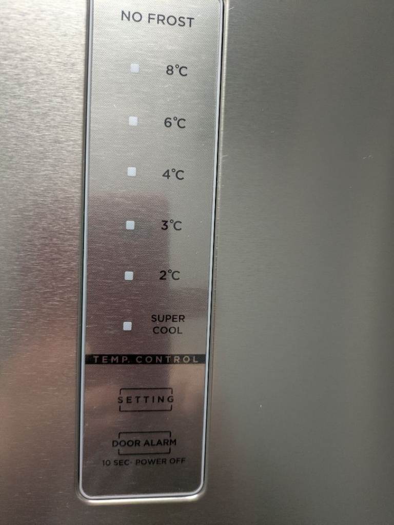 Stainless steel large frost free Kenwood fridge with water dispenser, door alarm and temperature gauge on the outside of fridge.