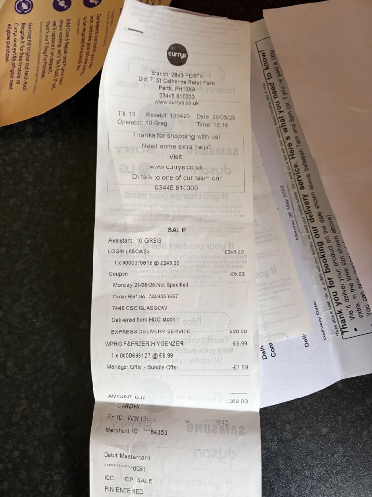 It's a reliable appliance with plenty of storage space Receipt from Currys is available. not year old