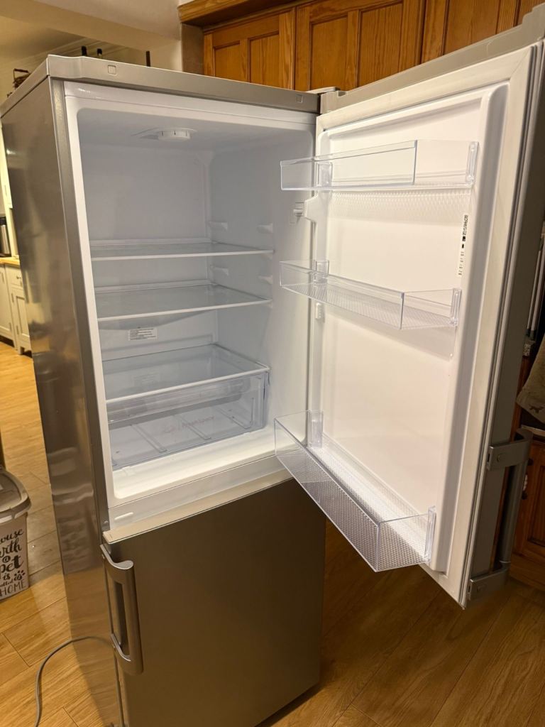Almost brand new Indesit freestanding 60/40 split fridge freezer. Stainless steel.