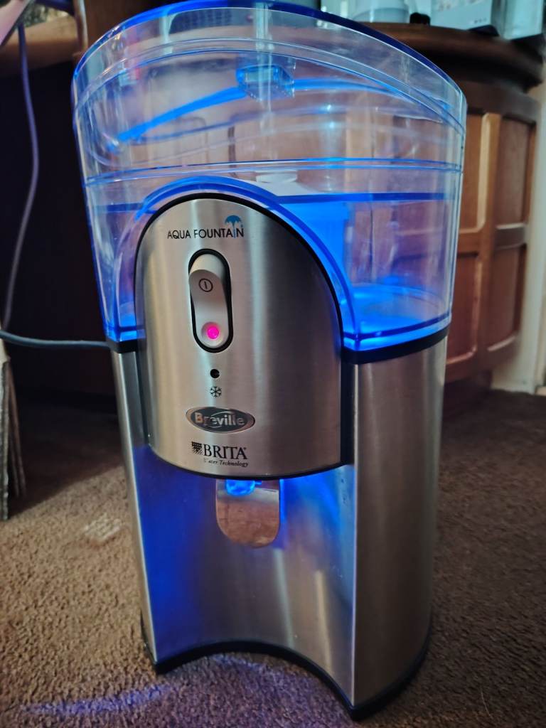 Breville Brita Aqua fountain, table top water cooler/chiller . 3 litre capacity, ideal for home, bedroom, office use etc. In Excellent condition. Can be used with or without standard Brita maxtra filter cartridges. Blue led night lights on or off. Easy fill via flip top. Collection from Airdrie. No Offers. £25