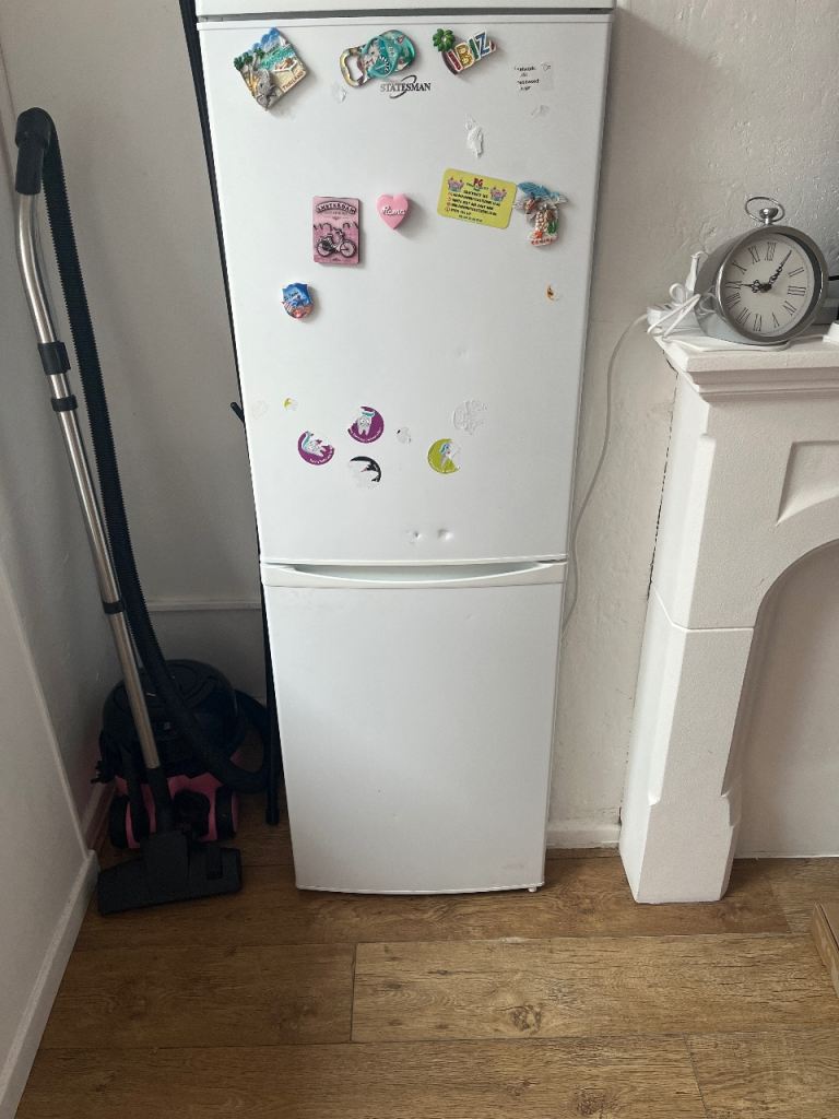Statemans white standard fridge freezer 2 dints in door but doesn’t effect use will do someone starting off or who doesn’t have much selling for £50 works perfectly fine just need rid as I’m getting new pick up only I will clean before gone and all stickers don’t worry