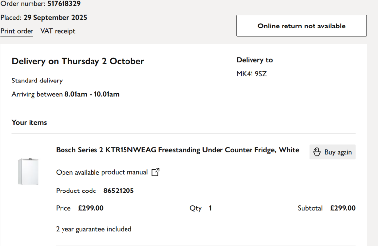 Posting for under a monthUnder 1 year old Bosch fridge Freestanding undercounter no ice-box KTR15NWEAG