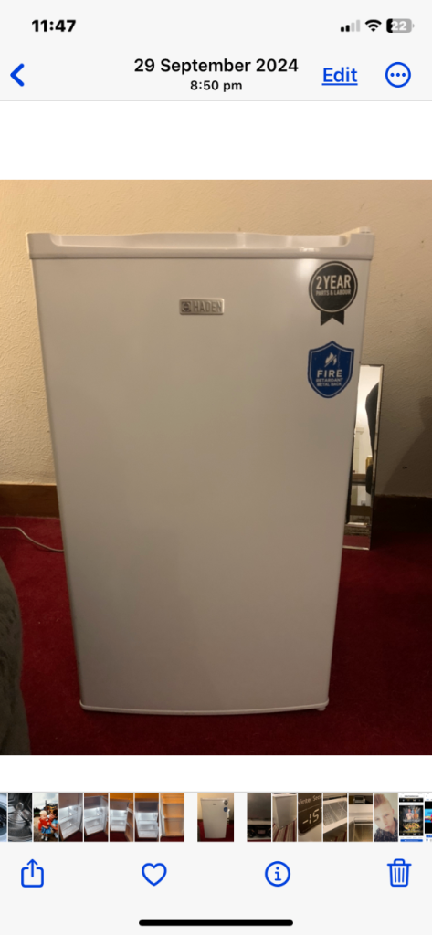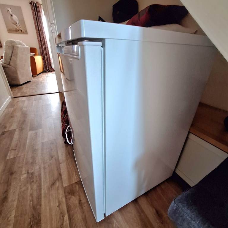 H85 x W56cm - Pristine condition only used for a few months as l suffer from scoliosis l made the mistake of buying an undercounter fridge and it's made it more difficult for me to keep bending to get things in and out of the fridge. When l bought it l had the door changed from one side to the other, you might decide to change it again. l have included the bill so that you can see when l bought it. l have also cleaned it thoroughly and it is ready for immediate use. The photo's are a bit distorted as I've had to put it in my narrow hall. This is a smoke and animal free house.