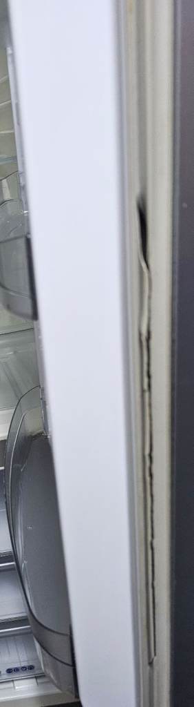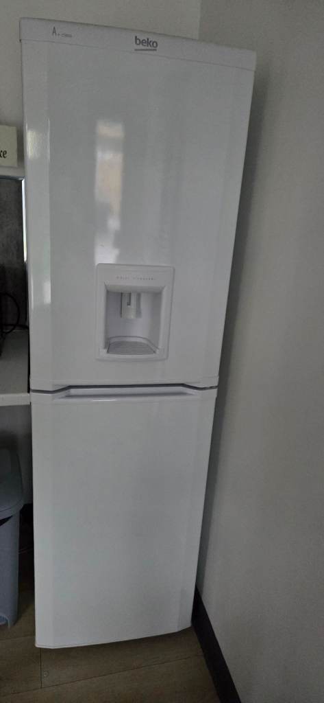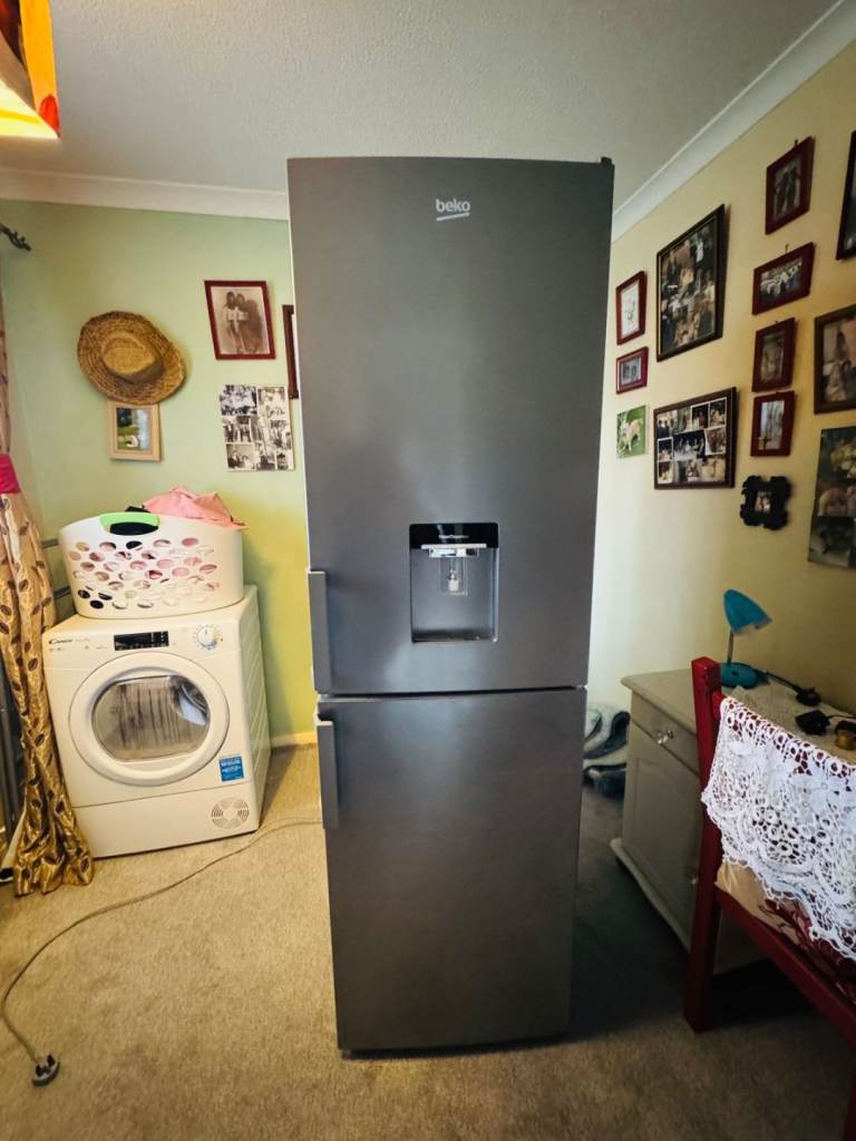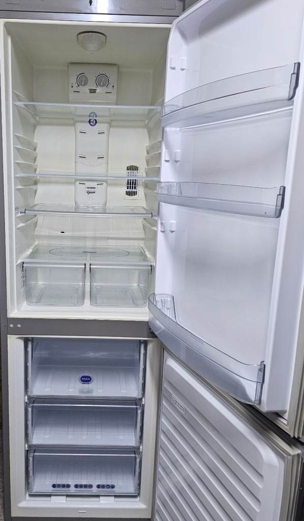 Whirlpool silver Total No Frost A class rated air circulation system fridge freezer inside light bulb needs replacing seal is little cracked but doesn't affect the use at all height 188cm width 60cm Depth 60cm perfect working order selling because had integrated appliances delivery available for a charge or you can collect
