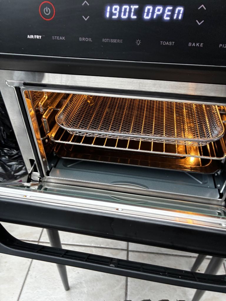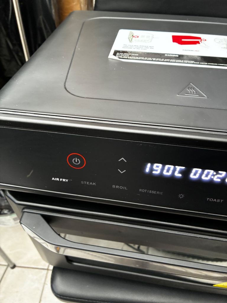 It features a digital display and various cooking functions including air fry, steak, broil, rotisserie, toast, bake, and pizza.