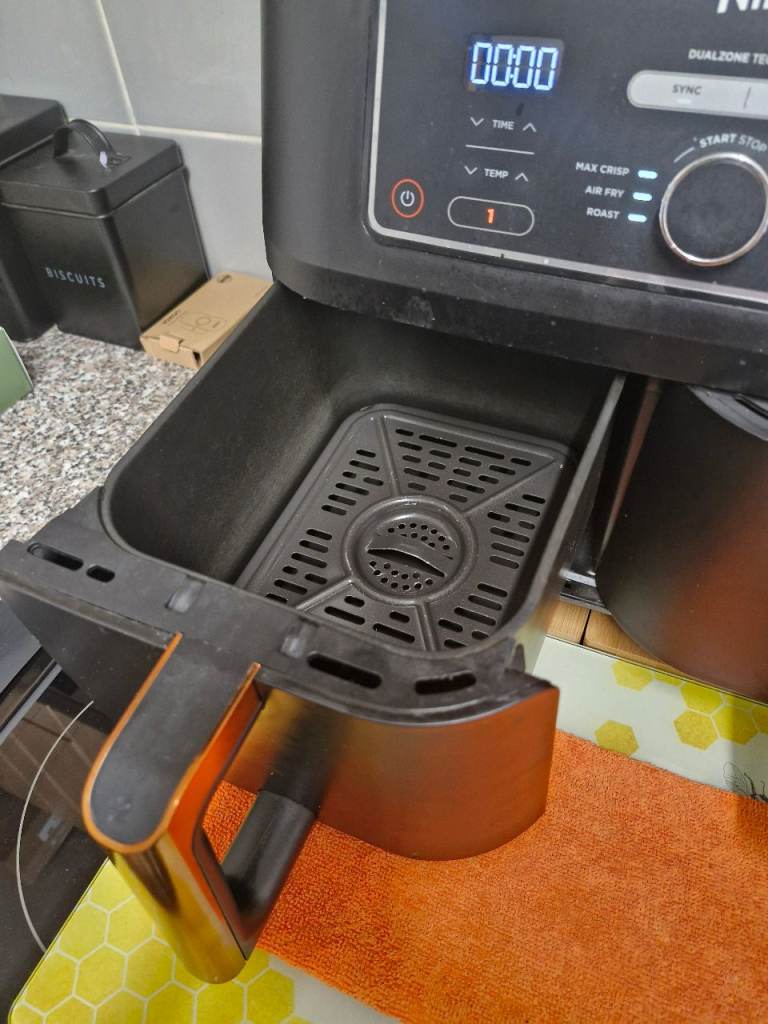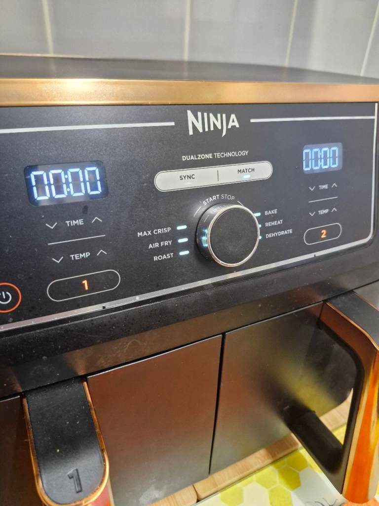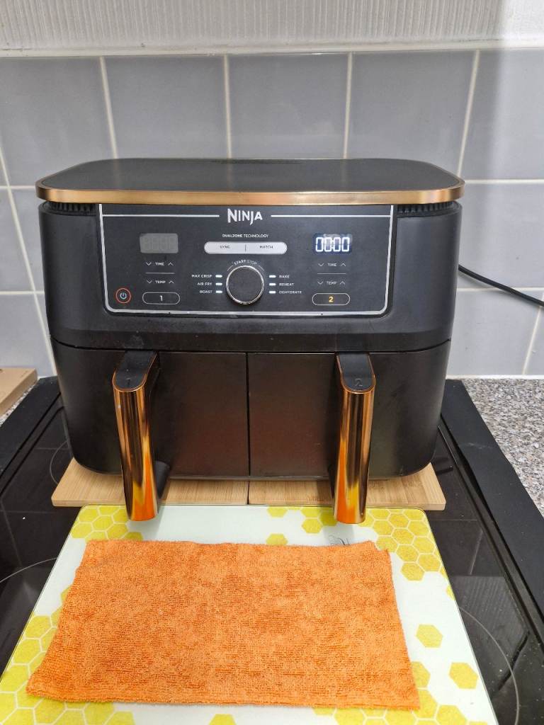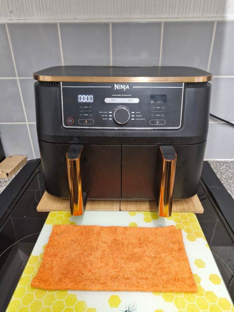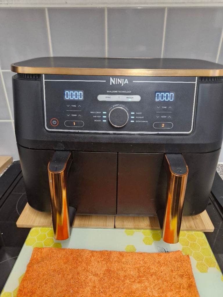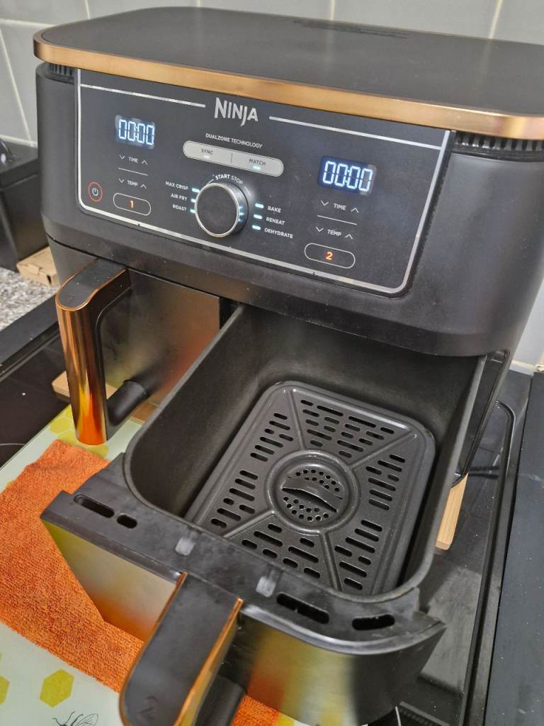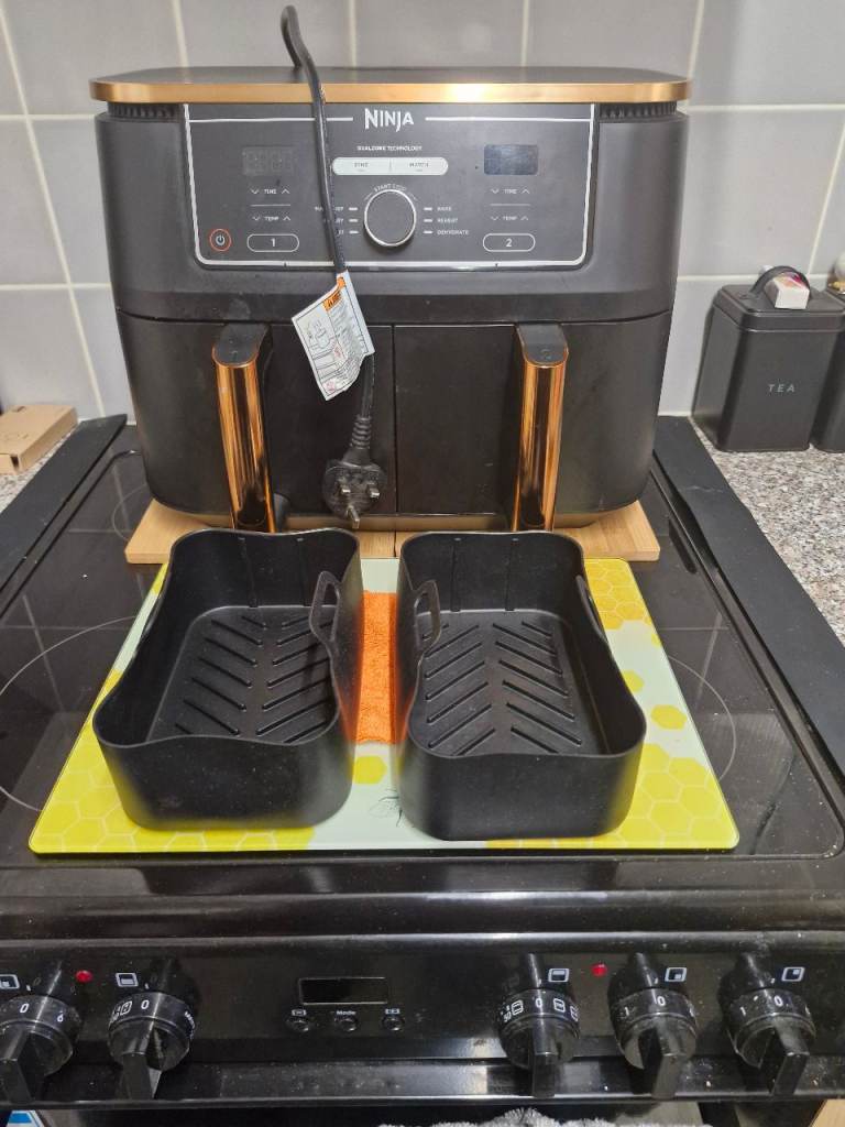 For sale ninja air fryer dual baskets in rose gold just under 2 years old in perfect working order and good condition I can't find the instructions but you can download it but very easy to use 9.6 litre capacity various functions dual sync technology only selling as purchased a single drawer air fryer which is better for me it does have some age related marks but nothing major atall and doesn't affect functionality comes with x2 silicone molds for cakes etc collection only and cash on collection thanks for looking please note no delivery