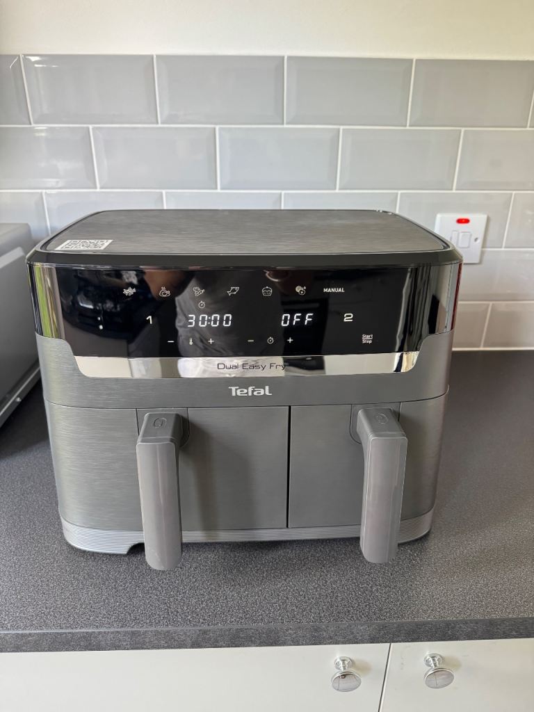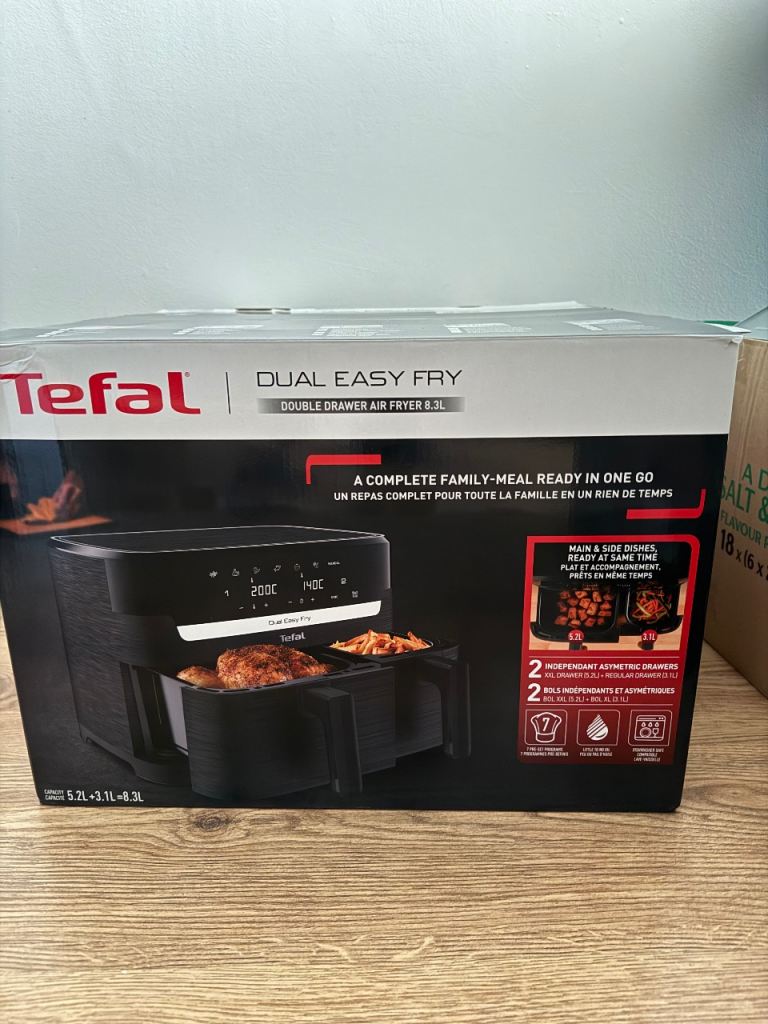- grab it at a discount due to the minor cosmetic marks. Tested for power-on only to confirm perfect functionality. Brand new Tefal Dual Easy Fry Double Drawer Air Fryer (Model EY905D40), never used and in superb overall condition. This versatile kitchen appliance comes in its original box Please note there is some minor scratch on the handle (as shown in photos) and at back side but these are purely cosmetic and do not affect functionality or performance and are not visible so much.