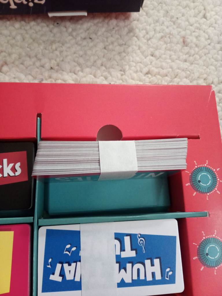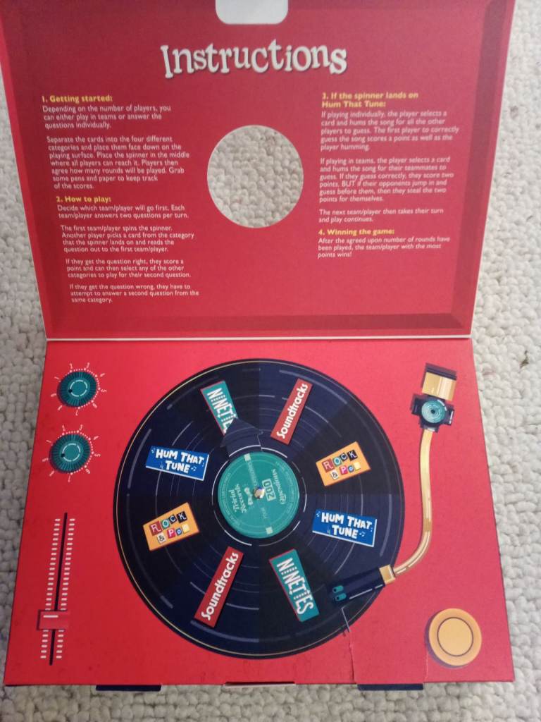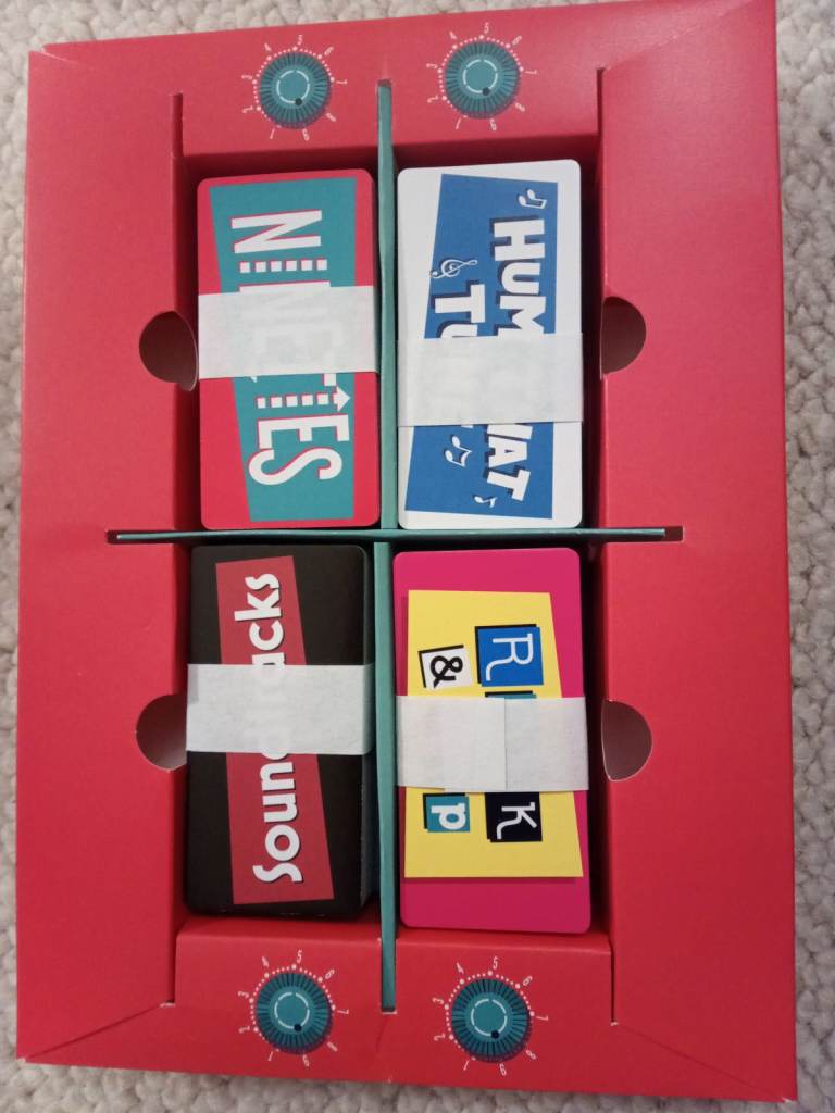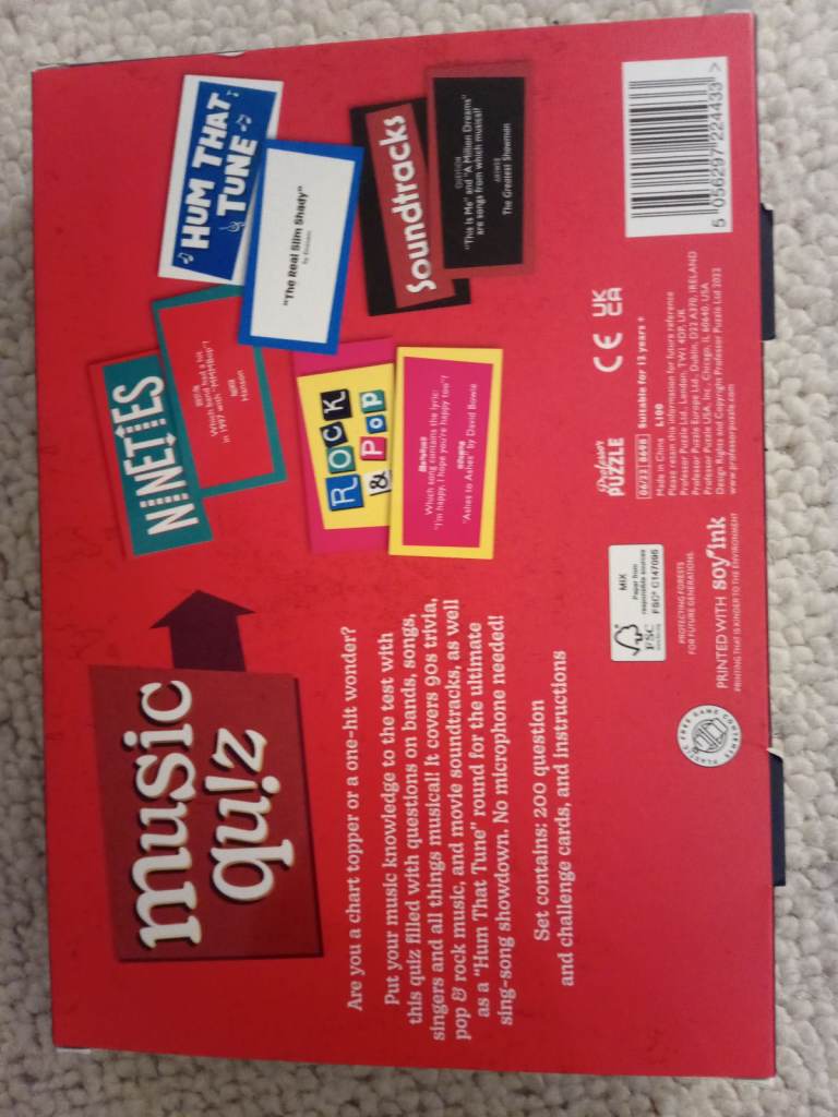 Music Quiz Game with 4 categories; nineties, rock and pop, hum that tune and soundtracks. Intended for 2 or more teams. Suitable for ages 12+. Opened but never played, cards are still bound.