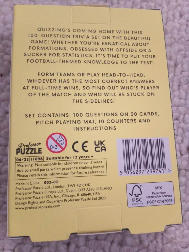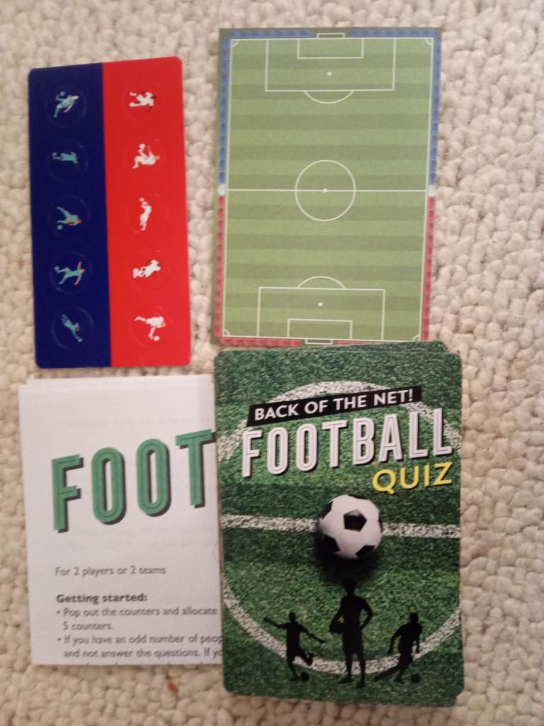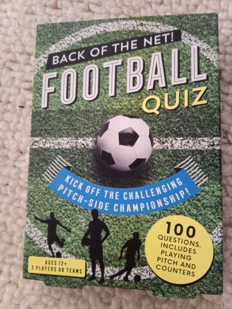 Football Quiz game, suitable for 2 players or teams. Includes100 questions, playing pitch, and counters. Suits forages 12+ . Never used. Counters are still to be 'popped' from the card. Price is for the 2. Willing to sell separately.