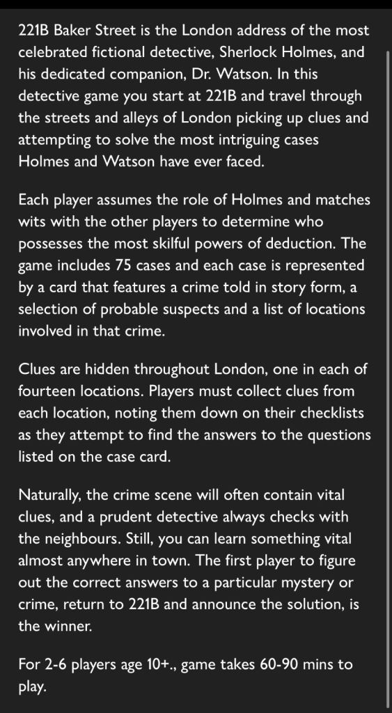 Each player assumes the role of Holmes and matches wits with the other players to determine who possesses the most skilful powers of deduction. The game includes 75 cases and each case is represented by a card that features a crime told in story form, a selection of probable suspects and a list of locations involved in that crime.