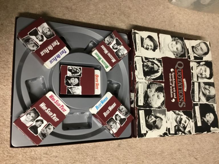 A quiz game based upon quotations from famous people. There are decks of Question Cards in different categories - True Or False, Quote Vote, Buzz Words, Missing Words, Who Said That? - and a set of player cards showing these sections. Players are dealt a hand of player cards, play one and must successfully answer the test on the relevant Question Card to dispose of it. Other players can poach questions to get rid of their own cards. First player to clear their hand wins.
