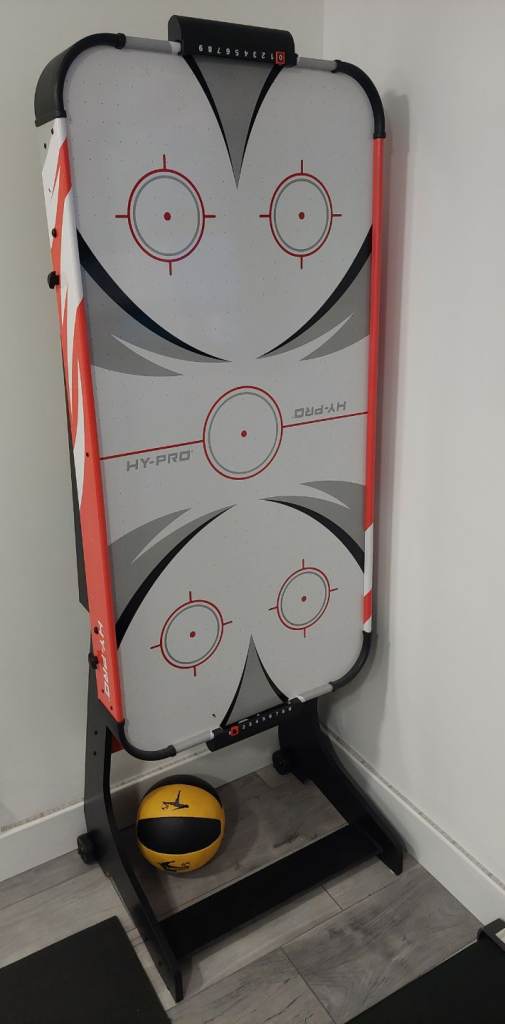 4ft foldable Hy-Pro air hockey table game. Great space saver when folded away and takes less than 2 minutes to unfold. Plug in to produce air for arcade-like experience. Barely used and therefore in good condition. Easily folded out for use (everything provided). Picture was taken while folded, however the additional illustration shows how it looks when in use. I also have the instructions manual for it. From a clean, non-smoker home.
