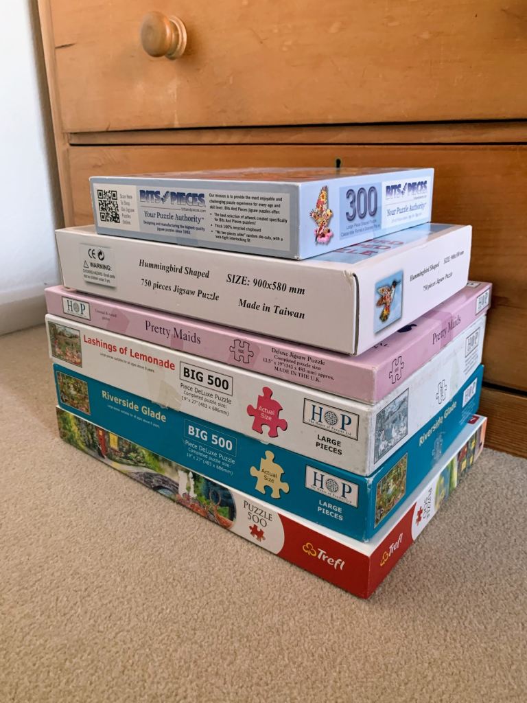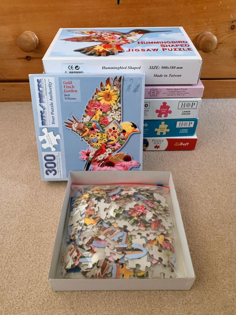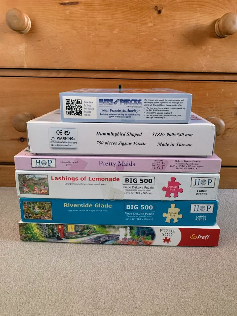 6 adult jigsaw puzzles, there’s a couple of tough ones in there plus a couple boxes with some strange shaped pieces