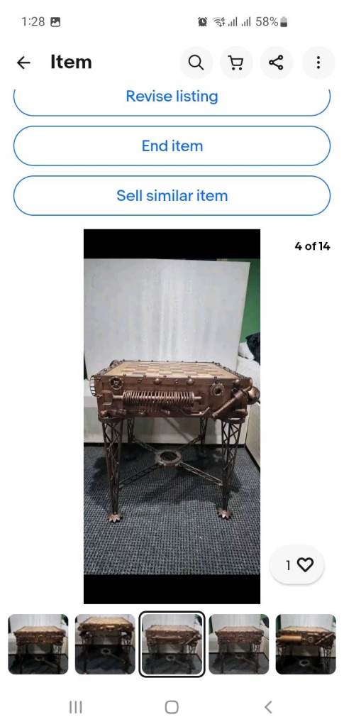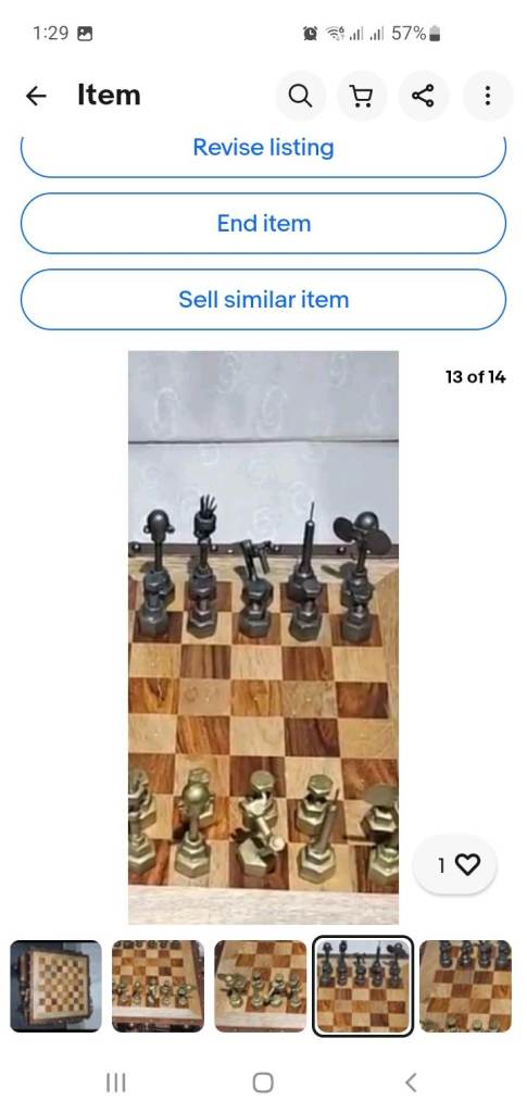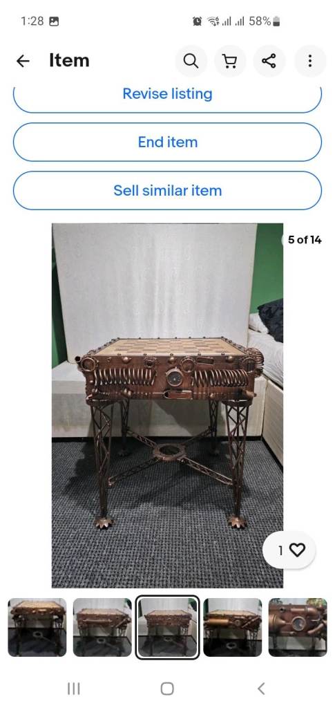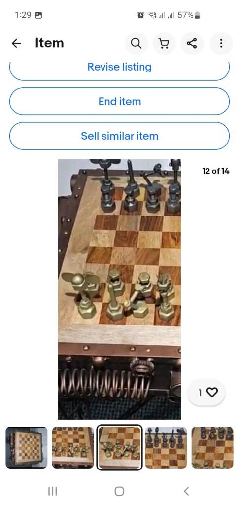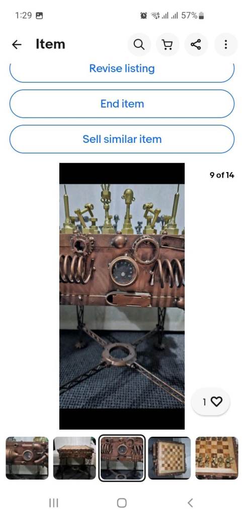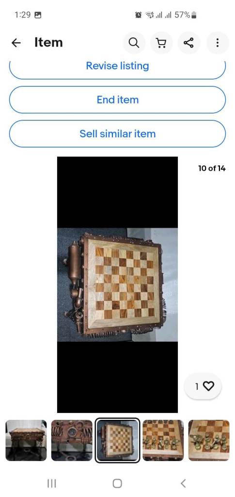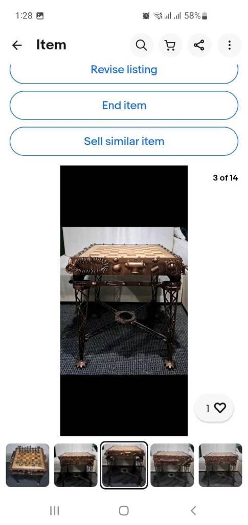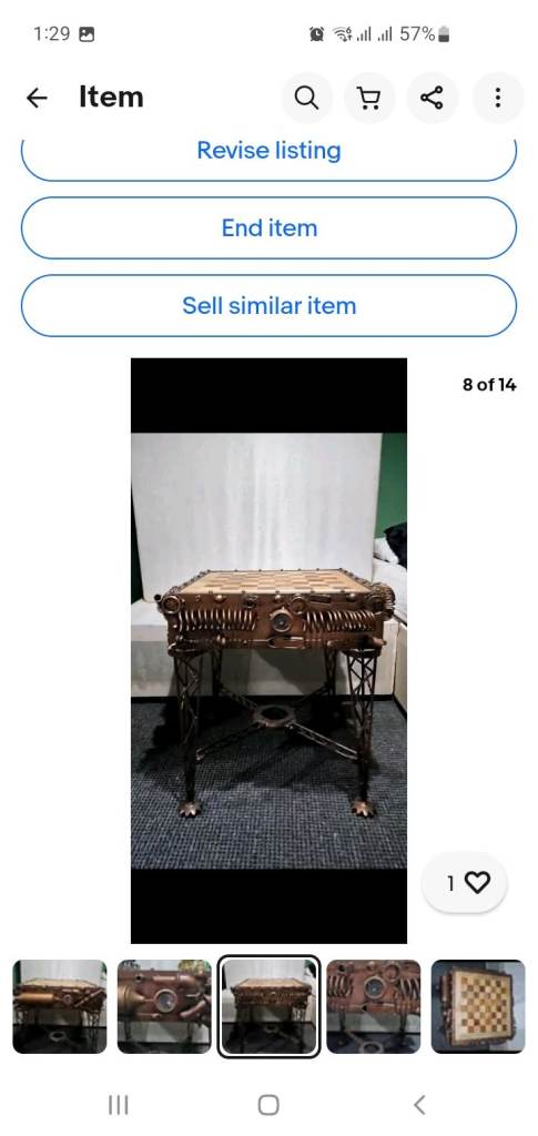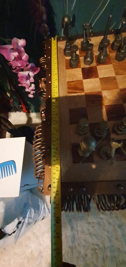 beautiful condition chess table made of brass and the pieces are made of brass also, the board I'm not sure whether is brass, also looks beautiful as an ornament , table is heavy and the legs can be unscrewed, top size is 22 inches diameter height 25 half inches and I bought this for 700 but will sell 500