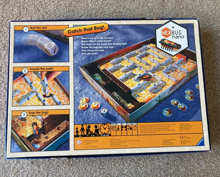 Fun play experience - you can play a game in 20 minutes for 2-4 players. Catch the Hexbug nano in this classic fun family board game.