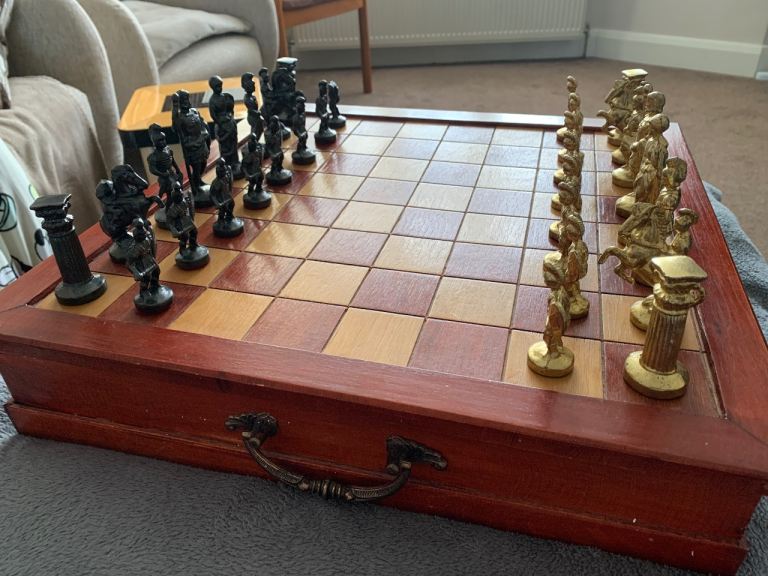 Heavy duty chess board made with metal brass. From Dubai. 2 pieces have head missing otherwise good condition. Nice for display and using. Sensible offers maybe accepted if quick collection. Antique style design. rare to find.