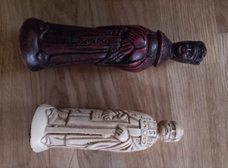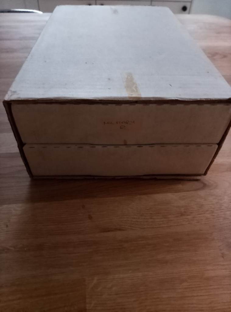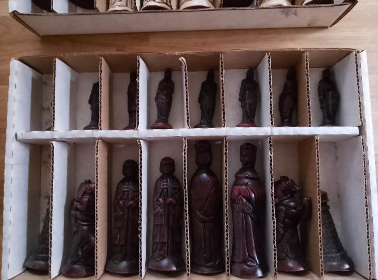 The product is a set of vintage collectable military resin chess pieces, featuring white and mahogany colours in their original box. The chess pieces are made of resin, giving them a unique and durable material quality. This set of chess pieces would be a standout addition to any collector's display or game night, boasting a touch of history and nostalgia with their military theme and classic white and mahogany colour scheme. Ideal for chess enthusiasts or military history buffs, these resin chess pieces are sure to be both functional and decorative.