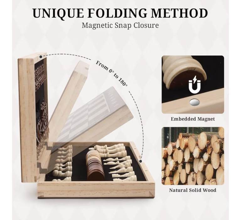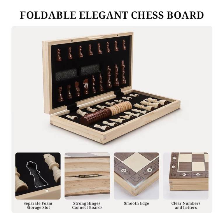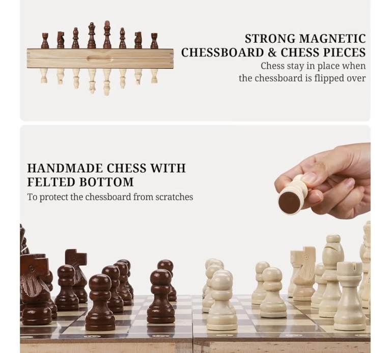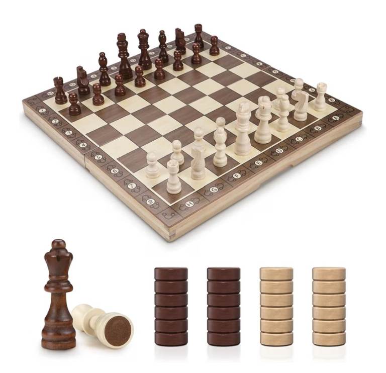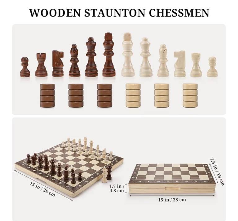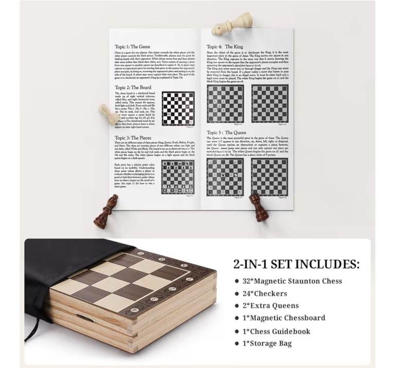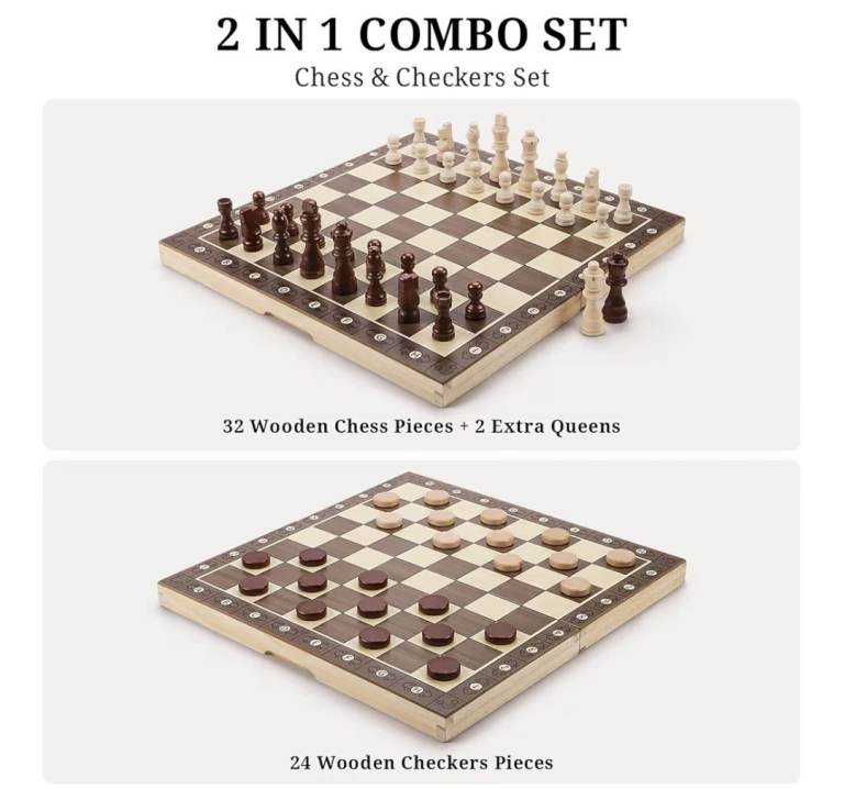 Chess Set, 15'' Wooden Chess Board with Wooden Staunton Pieces & 2 Extra Queen, 2IN1 Chess and Checkers Board Game, Folding Travel Chess Set for Adults Kids