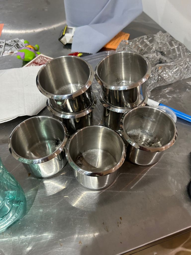Frame comes with built in legs that fold. The table is all one piece of solid wood. 7/10 cup holders come with it so yes 3 are missing. But still a bargain, i paid £600 for this table brand new.