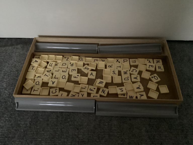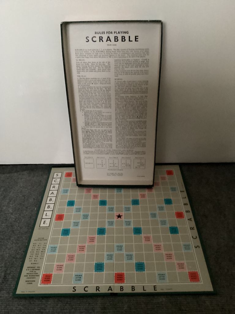 Scrabble board game, made in England by Spear’s with a grey / green board measuring 36 x36 cm Plastic racks 4of & tiles with black writing approx 2cm x2cm .Rules on back of lid. Approx 100 letters. In really good condition
