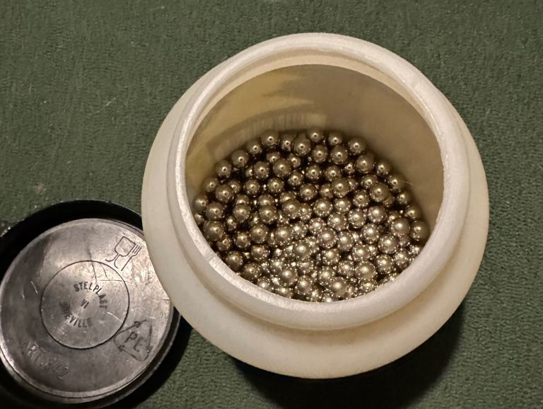 Original condition and complete with a large pot of stainless steel ball bearings.