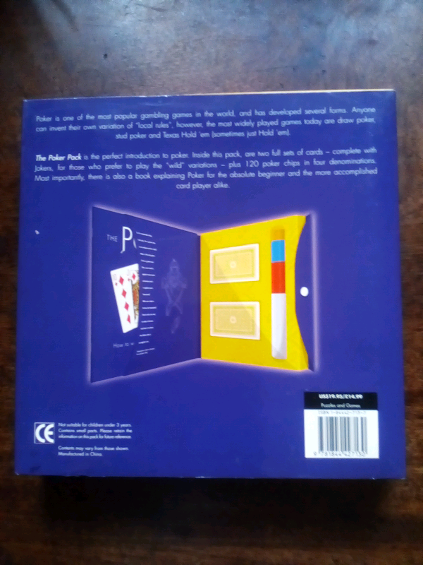 Contains two packs of cards, 120 poker chips of different values and a 48-page instructional book covering all the most popular versions of the game.